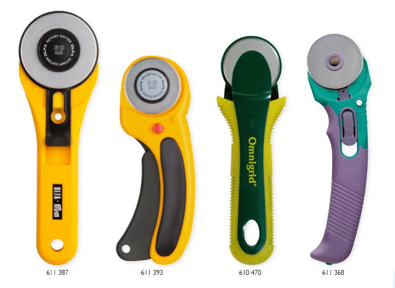 The rotary cutter: Several models and several sizes. On rotary cutter of middle size (45 mm-those come always in inches- funny!) is what you need in order to begin. The smaller the diameter of the cutter, the easier to cut curves. However I recommend the one mentioned above, because majority of cuts in patchwork are straight.