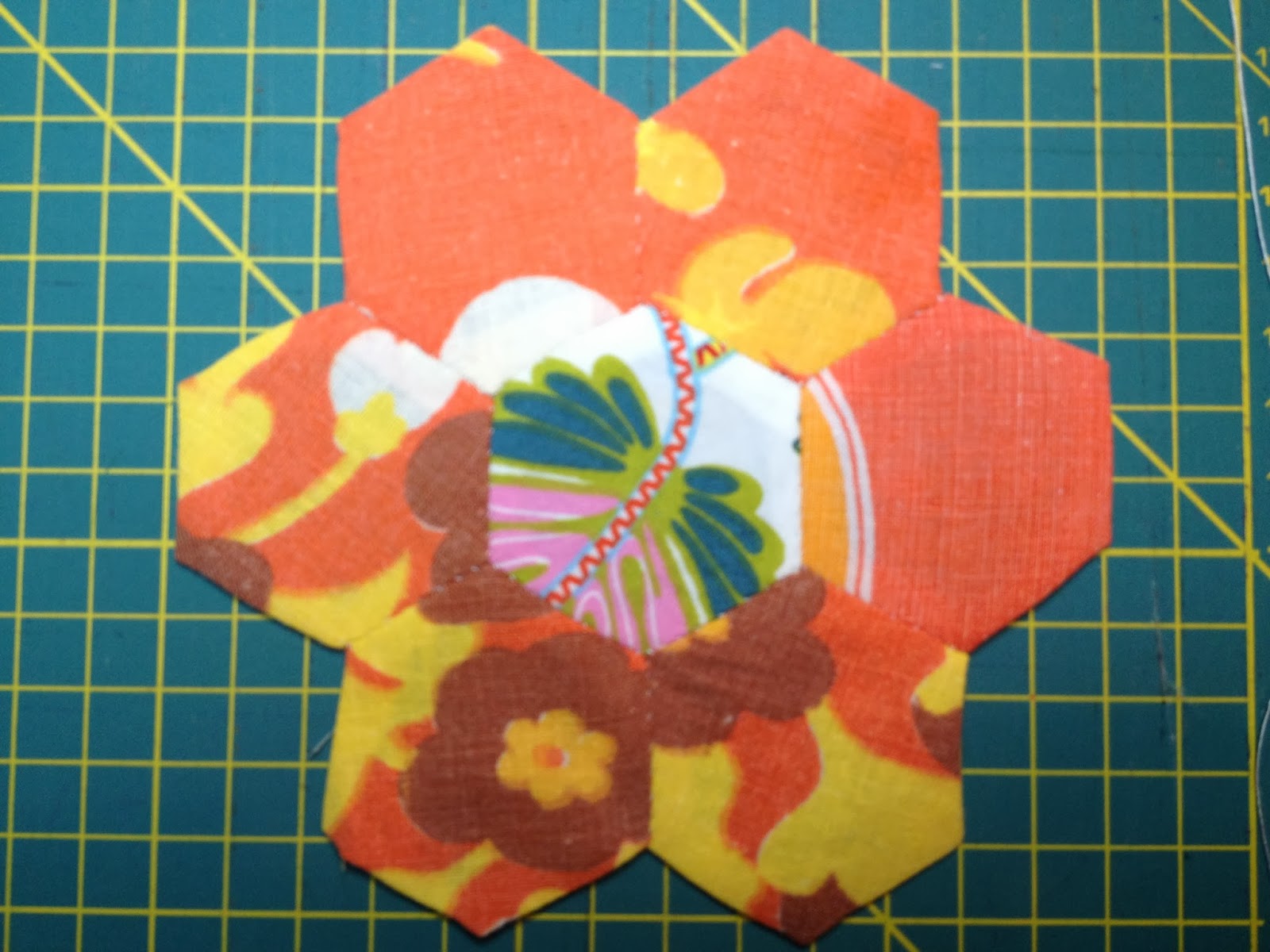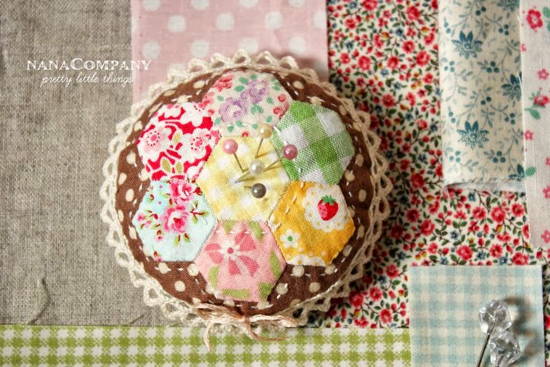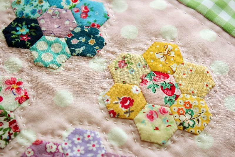 On both of those pictures, heaxongs form rosettes that have been appliquéd either on a pin cushion or on a quilt. Pay attention to the hand quilting (photos from blog “nanacompany”). This technique longs for hand quilting.