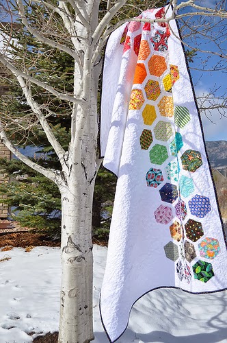 Take a look at this quilt from blog “we shall sew”. Hexagons have been appliquéd to a modern quilt.