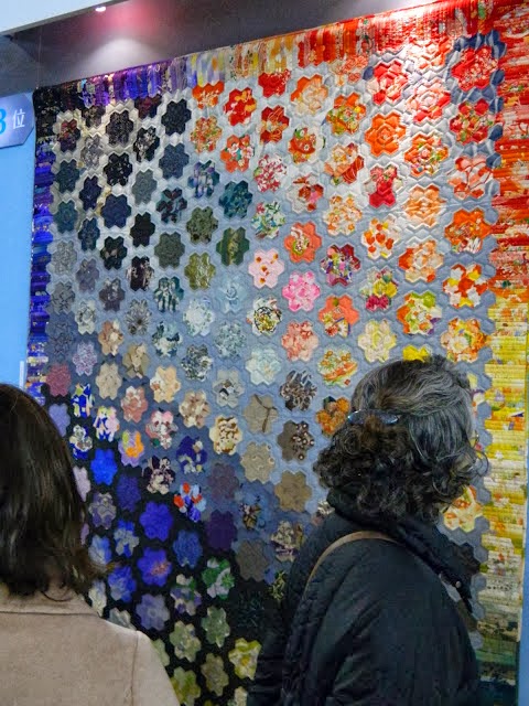 Have also a look at this picture of the site “Sewhomegrown” (quilt from International Quilting Festival of Tokyo). Hexagons have been placed so that they form rosettes with blank hexagons between them.