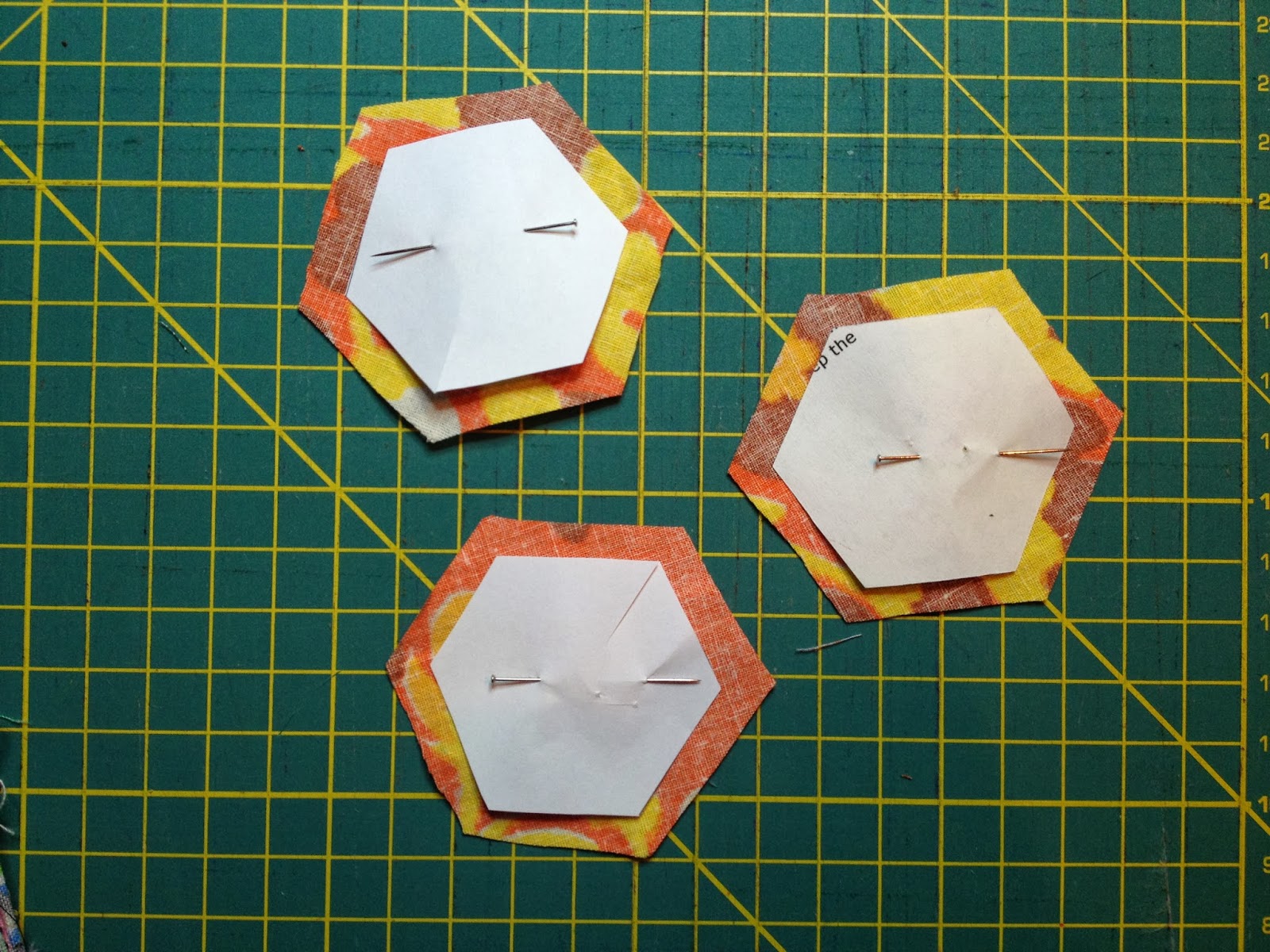 You cut stripes of the fabric. The width of the stripes is the height of the hexagons plus the seam allowance. You pin the jexagons (blue shapes on the drawing) and you cut with your rotary cutter on the red dotted lines. Faster!