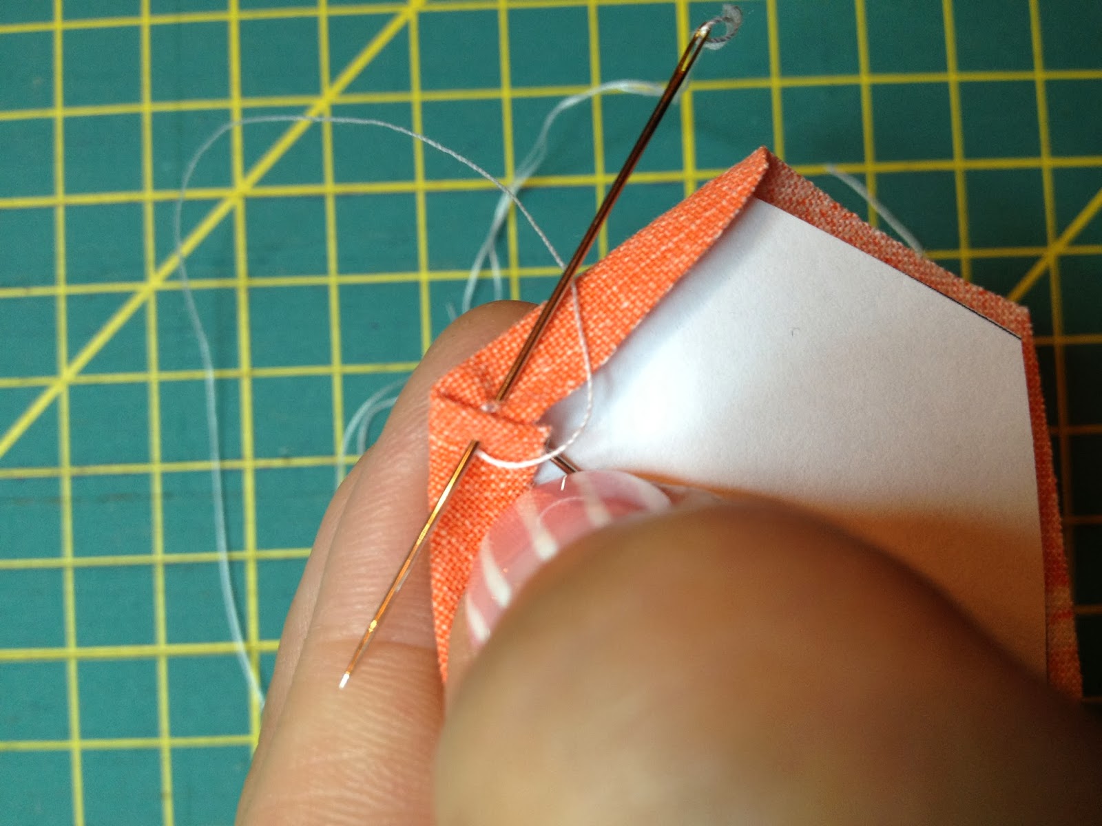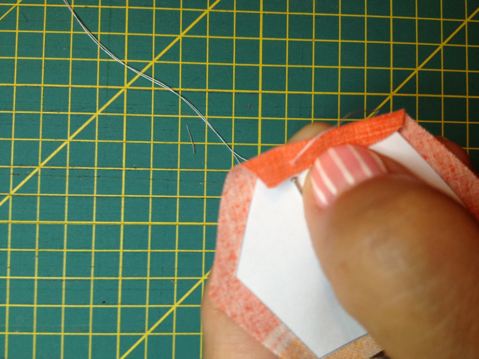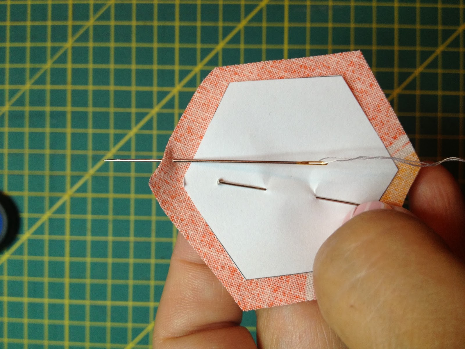 Let’ s go sew them together. We put two hexagons right sides together and start joining. You may need to fold the hexagons in some instances in order to be able to sew. Take a few very tiny stitches from one corner to the other.