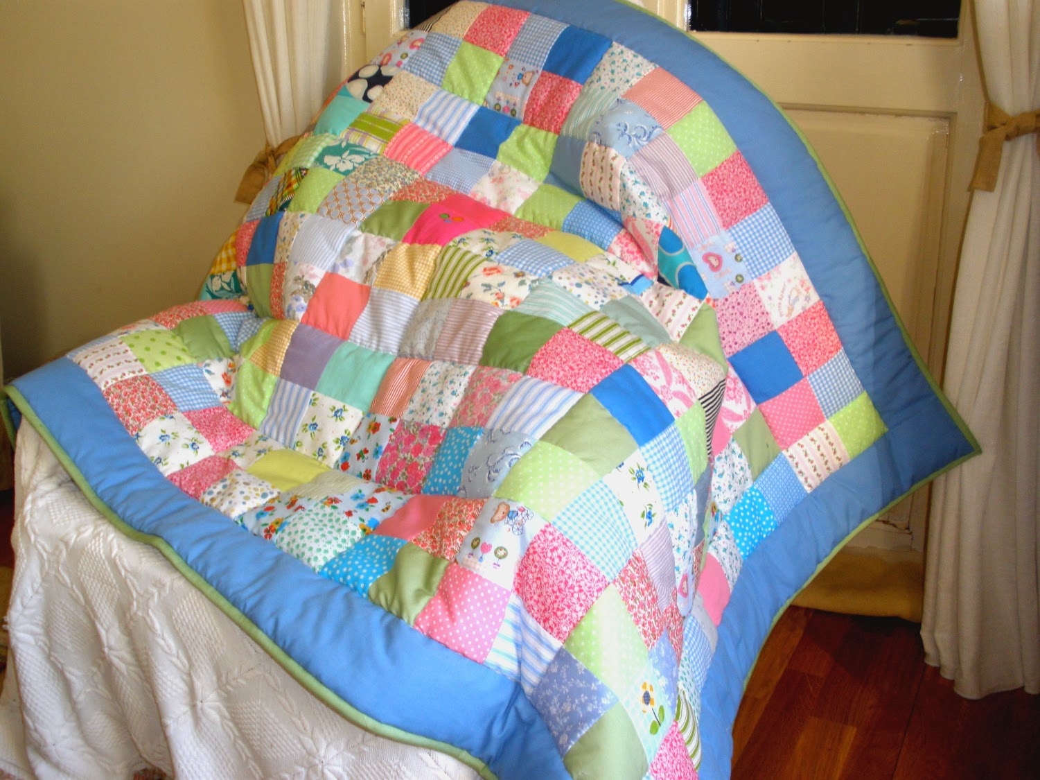 So Ada started teaching just after the exhibition. And then her students loved quilting and wanted to keep in touch between them, because they had a great time whereasthey learned new tehcniques and made beautiful things. It was something like that that started the quilting bee of Sparta. They aim to make a few quilts of various sizes, in order to be given to people in need next Christmas.