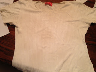 Χθες ήρθε η ώρα να φρεσκάρω δυο παμπάλαια μπλουζάκια (20ετίας σίγουρα αλλά και εξαιρετικής ποιότητας), τα οποία έχω φορέσει πολύ αλλά τα έχω βαρεθεί και επιπλέον μου έχουν κοντύνει. Πήρα λοιπόν δυο μέτρα δαντέλα από το 1 Ευρώ το Μέτρο (Νικίου 22) για το κίτρινο και άλλο μισό μέτρο για το ιβουάρ από τον Ερωτόκριτο (Περικλέους 42). Το φάρδος της κίτρινης ήταν 20 εκατοστά, ενώ της ιβουάρ ήταν 1,40 και για το λόγο αυτό πήρα και μισό μέτρο.