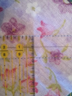 Το να κάνουμε σχέδια με τρίγωνα είναι τόσο μα τόσο εύκολο και έχει κι έναν τρόπο που πριν ξεκινήσω το πάτσγουωρκ ούτε καν πέρναγε από το μυαλό μου. Τι κάνουμε: Παίρνουμε δύο τετράγωνα του ίδιου μεγέθους και τα καρφιτσώνουμε καλή με καλή. Τραβάμε με το χάρακα κι ένα μολύβι μια γραμμή στη μια διαγώνιο.