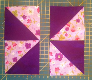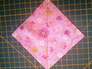 Τα αρχικά μας τετράγωνα μεταμορφώθηκαν σε μικρότερα πάλι τετράγωνα που αποτελούνται όμως από δυο τρίγωνα το καθένα. Στο σημείο αυτοί ορισμένοι τα σιδερώνουν. Εγώ το αποφεύγω, γιατί ξεχειλώνουν λίγο, ειδικά με τον ατμό. Πρώτα ανοίγω τη ραφή όσο καλύτερα μπορώ με το νύχι μου (finger pressing) α. Με το ψαλίδι κόβετε τα «αυτάκια» που περισσεύουν.