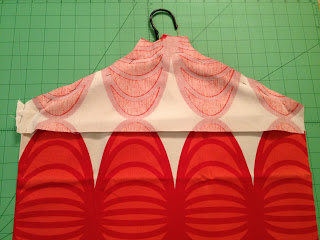 Τα υλικά μου ήταν ένα κομμάτι ύφασμα και μια γερή κρεμάστρα. Έκοψα ένα κομμάτι ύφασμα όσο μακρύ χρειαζόταν και μετά ένα μικρότερο για την επάνω πίσω πλευρά, όπως βλέπετε στην παρακάτω φωτογραφία. Το έραψα εκεί που βλέπετε τις καρφίτσες, αφήνοντας πάνω – πάνω μια τρύπα για να μπορεί να περάσει η κρεμάστρα.