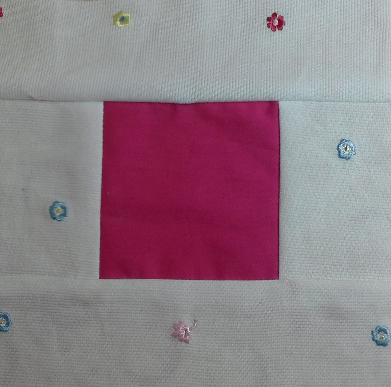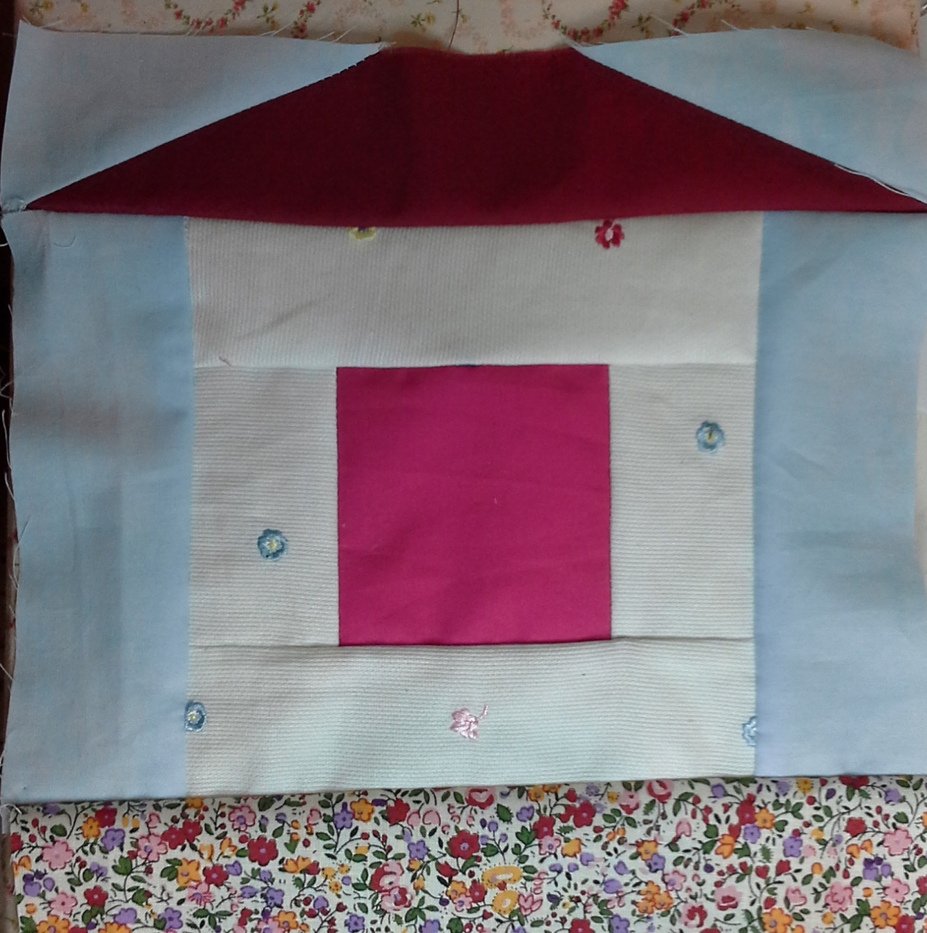 Τώρα είστε έτοιμοι να ξεκινήσετε το στήσιμο του τετραγώνου. Ξεκινήστε με το τετράγωνο του παραθύρου και ράψτε δεξιά και αριστερά τις δύο λωρίδες από το ύφασμα των τοίχων που έχουν μήκος 8,5 εκ.