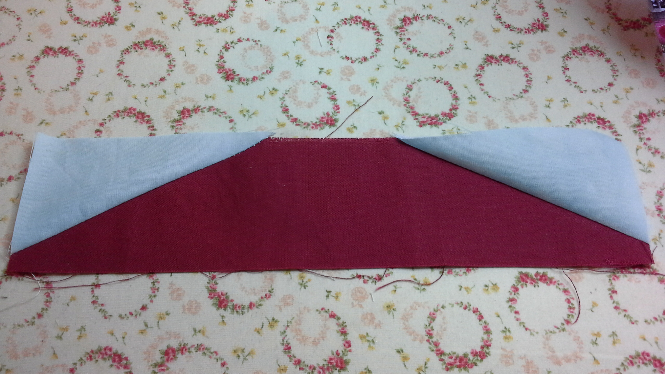 Από το ύφασμα του ουρανού: 2 λωρίδες μήκους 16,5 εκ, 2 λωρίδες 24 εκ., 1 λωρίδα 30 εκ. και 1 λωρίδα 9 εκ. Τη λωρίδα αυτή την τελευταία την κόβετε πάνω στη διαγώνιο.