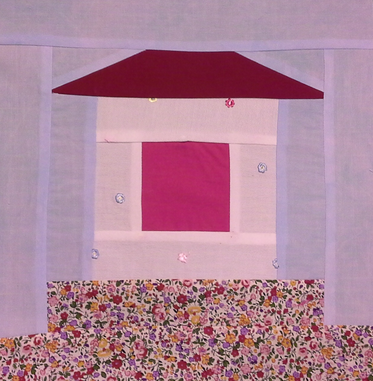 Για να φτιάξετε το σπιτάκι αυτό, θα χρειαστείτε ύφασμα για τον ουρανό, για τη γη, για τη στέγη, το παράθυρο και τους τοίχους (5 διαφορετικά υφάσματα). Θα κόψετε από το ύφασμα του παραθύρου ένα τετράγωνο 8,5 επί 8,5 εκ. και από καθένα από τα υπόλοιπα υφάσματα, λωρίδες φάρδους 5,5 εκ., ως εξής: