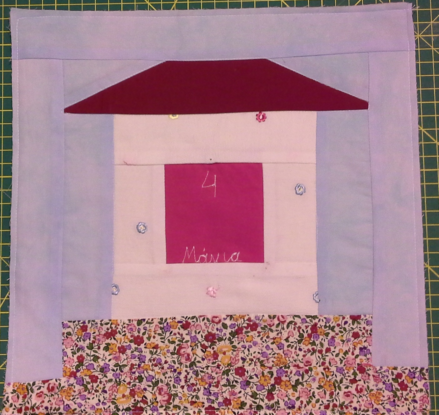 Ώρα για σίδερο. Προσοχή πιέζοντας και όχι πέρα δώθε, γιατί το σχέδιο αυτό έχει την τάση να ξεχειλώνει. Σαντουιτσάρετε με τη βάτα και το κομμάτι της πίσω πλευράς. Καπιτονάρετε πολύ ελαφριά (για αρχαρίους είπαμε το σχέδιο αυτό), περιγράφοντας ουσιαστικά το σπιτάκι και μόνο.Τετραγωνίστε στα 30 εκ. κόβοντας ό,τι περισσεύει. Κάντε και ένα γαζί περιμετρικά για να στέκεται όμορφα το τετράγωνο.