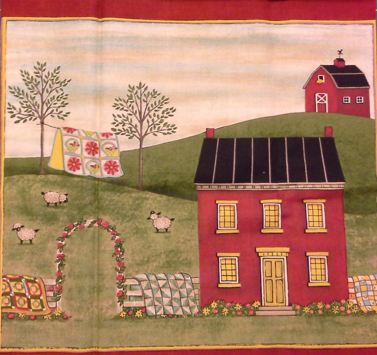“Κλέβω” και σήμερα αλλά δεν άντεχα να μην το φτιάξω αυτό το τετράγωνο. Δείτε τι όμορφο ύφασμα. Όμορφο σπίτι, ωραία χρώματα, εξοχή, προβατάκια, και παπλώματα μικρά – μικρά. Αυτά ήταν που με ξετρέλαναν και το έφτιαξα.