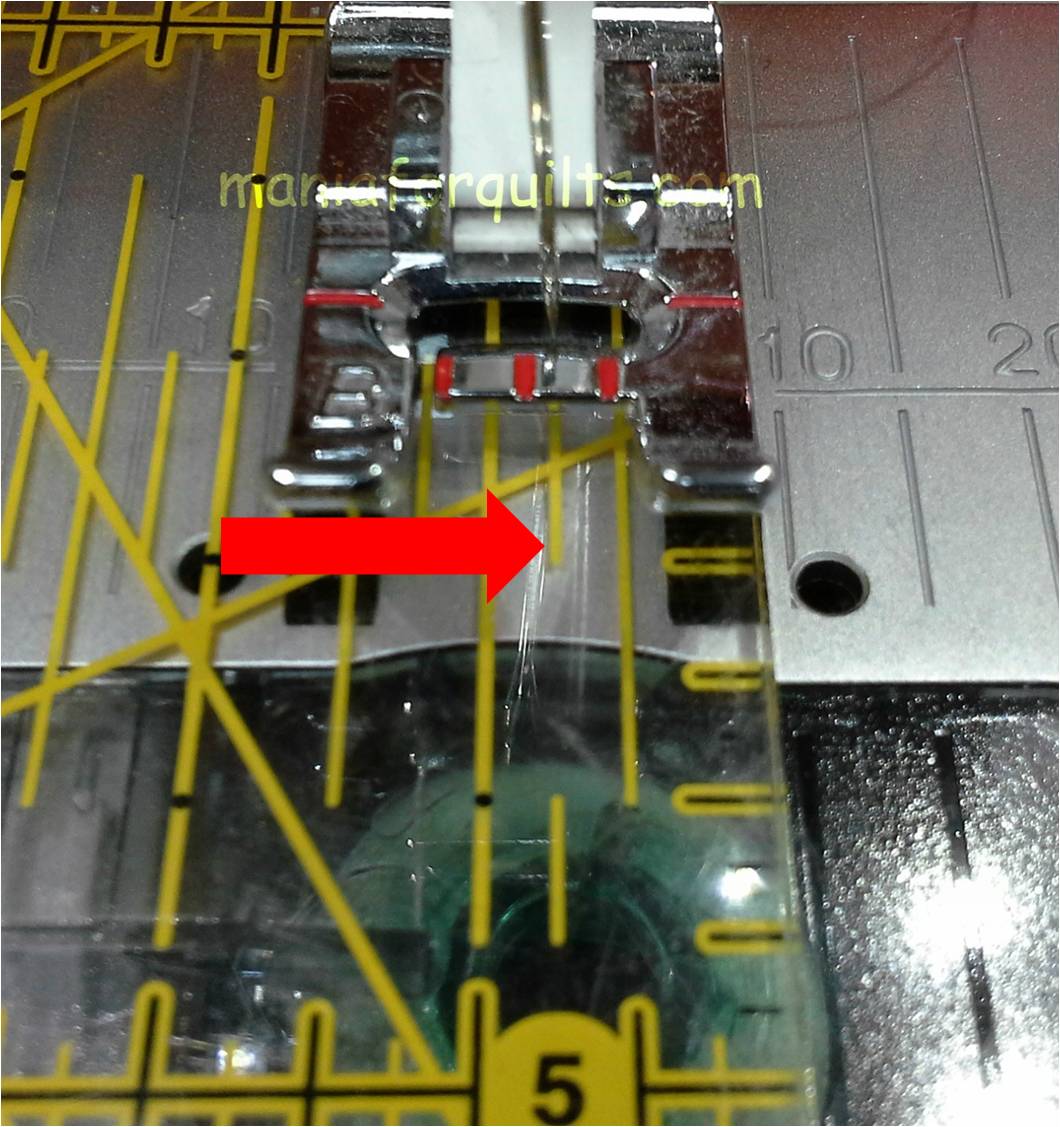 Τι κάνουμε αν το ποδαράκι μας είναι μικρότερο; Το πιο απλό είναι να αγοράσουμε ένα ποδαράκι. Το κόστος είναι μικρό για τα απλά ποδαράκια μηχανής. Αν όμως προτιμάμε να κρατήσουμε αυτό που έχουμε, κάνουμε πάλι την ίδια διαδικασία μέτρησης και στη δεξιά πλευρά του χάρακά μας μπορούμε είτε να τραβήξουμε μια γραμμή με ανεξίτηλο μαρκαδόρο είτε να βάλουμε μια ταινία, ώστε το ύφασμά μας να ακουμπάει σύριζα στη γραμμή ή την ταινία.