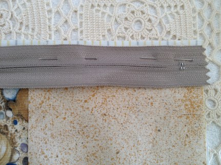 Στερεώνουμε με καρφίτσες το φερμουάρ καλή με καλή, δηλαδή η καλή πλευρά του φερμουάρ θα βλέπει την καλή μεριά του υφάσματος. Καλό είναι οι καρφίτσες να είναι κάθετες στο φερμουάρ (όχι όπως τις βλέπετε στη φωτογραφία), ώστε να περνάει η βελόνα από πάνω τους χωρίς να σπάει.