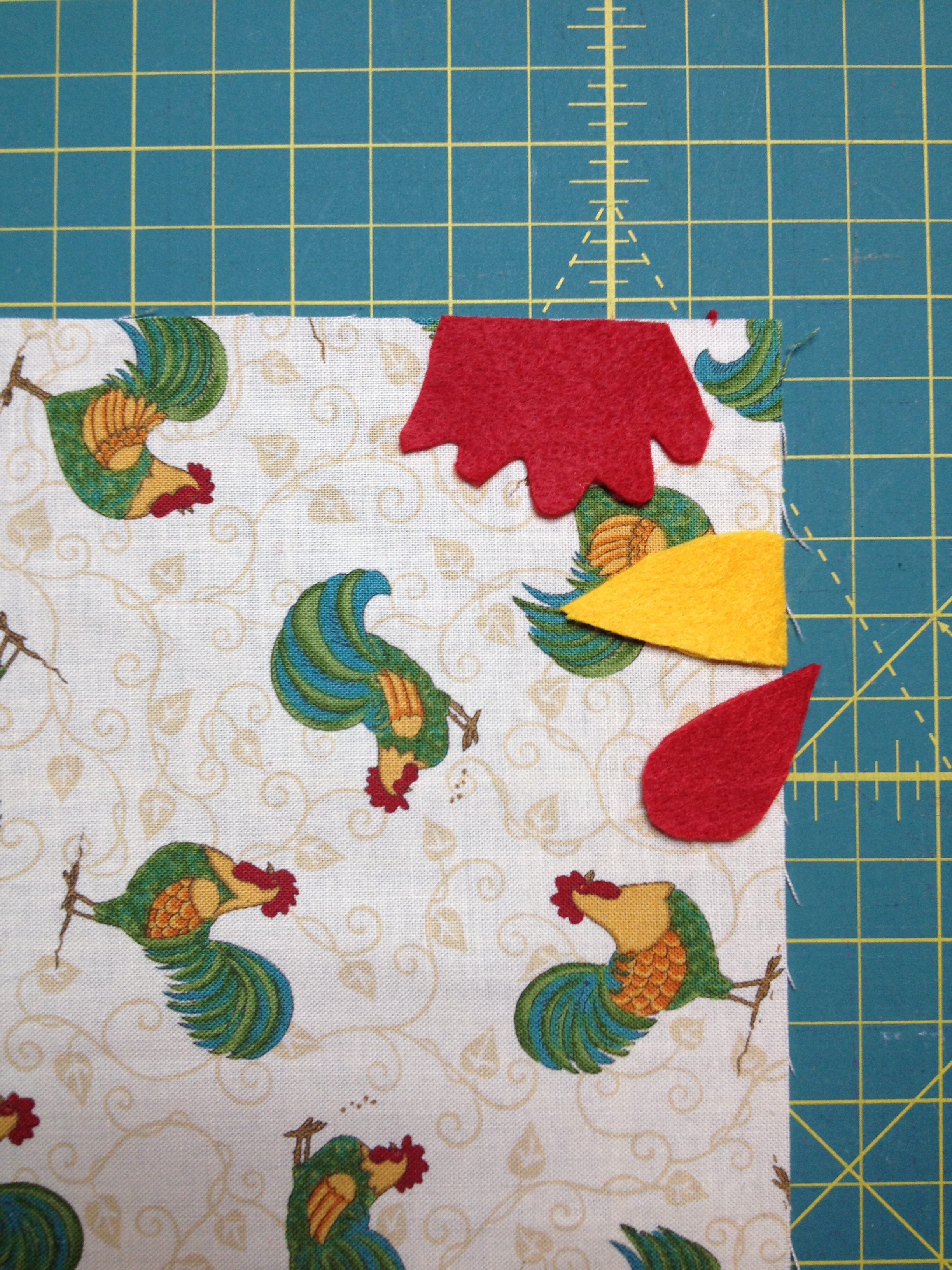 Ένα κομμάτι ύφασμα, όπου η μακριά του πλευρά θα είναι δυο φορές όσο η κοντή του πλευρά. Η κότα που έκανα εγώ έγινε με ένα κομμάτι ύφασμα 15 επί 30 εκατοστά (6″ επί 12″). (Προσοχή μην μπερδευτείτε με την επιφάνεια κοπής μου όσοι δουλεύετε με εκατοστά. Κατά λάθος μου είχε ξεμείνει σε ίντσες από την προηγούμενη δουλειά μου).Τα λειριά και τα υπόλοιπα θα τα φτιάξετε από φετρίνα ή άλλο ύφασμα που έχετε. Αν είναι ύφασμα που ξεφτάει θα πρέπει να καρικώσετε. Η φετρίνα δεν έχει αυτό το πρόβλημα.
