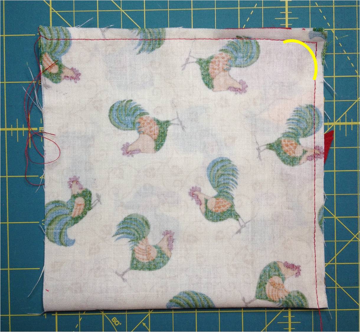 Βάζετε τα λειριά και το ράμφος όπως βλέπετε στην κάτω αριστερή φωτογραφία και διπλώνετε το ύφασμα κατά μήκος καλή με καλή. Καρφιτσώνετε στο σημείο που είναι η φετρίνα και γαζώνετε τις πλευρές, όπως βλέπετε στη φωτογραφία κάτω δεξιά. Θυμηθείτε στην πάνω δεξιά γωνία να κάνετε τη στρογγυλάδα που βλέπετε με κίτρινο, γιατί έτσι βγαίνει λίγο πιο όμορφη η κότα. Αφήνετε ανοιχτή την αριστερή πλευρά.