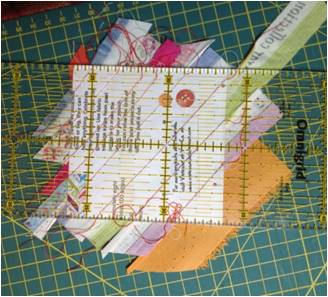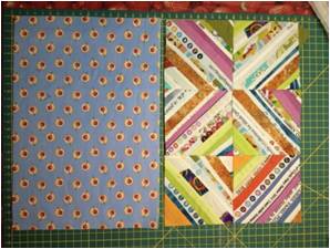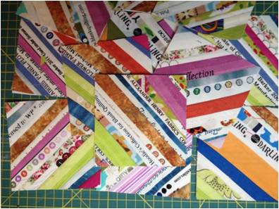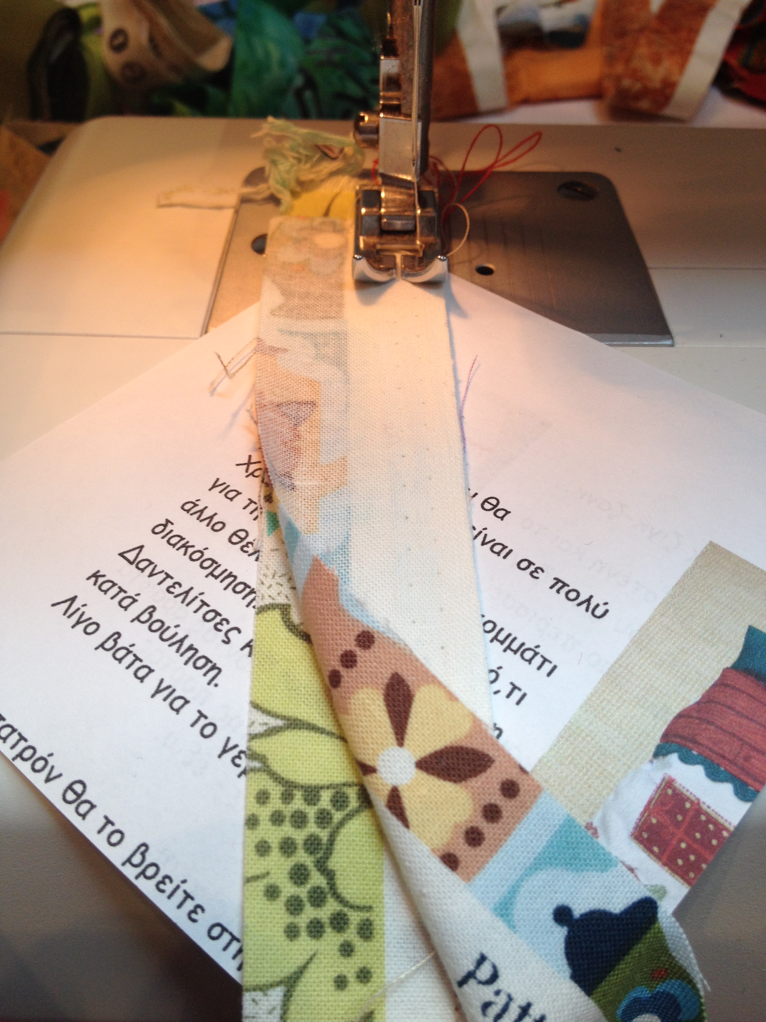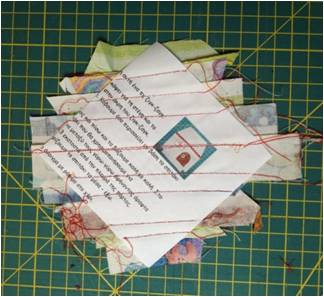 Παίρνουμε τα χαρτάκια και τις λωρίδες, όσο μακριές είναι και πάμε στη ραπτομηχανή μας. Όταν ράβουμε πάνω σε χαρτί, βάζουμε το μήκος του γαζιού μας στο 1,5, ούτως ώστε, όταν σκίσουμε το χαρτί, και να σκίζεται πιο εύκολα αλλά και να μην ξηλώνεται το ύφασμα. Βάζουμε μια λωρίδα πάνω στη διαγώνιο του χαρτιού μας με την καλή μεριά προς τα πάνω. Ακουμπάμε μια άλλη λωρίδα καλή με καλή με την κεντρική και ράβουμε στην άκρη (κάτω αριστερή φωτό). Το περιθώριο ραφής στην περίπτωση αυτή δεν έχει καμία σημασία. Μπορείτε να ράψετε όσο άκρη θέλετε, αρκεί να ραφτούν οι δύο λωρίδες. Κόβουμε και από τις δύο λωρίδες όσο περισσεύει από το χαρτί πάνω και κάτω. Ανοίγουμε με το νύχι μας τη ραφή και συνεχίζουμε με τον ίδιο τρόπο ράβοντας λωρίδες καλή με καλή προς τη μία γωνία και αφού τελειώσουμε τη μια πλευρά, συνεχίζουμε και από την άλλη, κόβοντας κάθε φορά ό,τι περισσεύει. Το αποτέλεσμα το βλέπετε στην κάτω δεξιά φωτό.