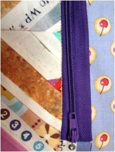 Take a zipper 10 cm or 4 ” bigger than the long side of the above pieces. Cut two selvage pieces of 10 ch or 4″ each (left photo). Place the zipper between the two sewn pieces.Fold each selvage piece and pin it on the zipper. Then sew it in place as you see on the central photo. Be aware of the zipper to be open. Trim the zipper pieces that are beyond the selvage we just sew.