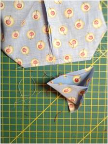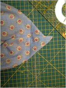 Παίρνουμε τώρα τα δύο κομμάτια που μόλις φτιάξαμε και τα βάζουμε καλή με καλή, όπως βλέπετε στην κάτω αριστερή φωτό. Γαζώνουμε γύρω – γύρω, αφήνοντας ένα άνοιγμα στην κάτω πλευρά του εσωτερικού υφάσματος. Αφού γίνει κι αυτό, πάμε να δώσουμε λίγο όγκο στο τσαντάκι μας. Κατ΄αρχήν στο εσωτερικό ύφασμα. Φέρνουμε την πλαϊνή ραφή πάνω στη ραφή του κάτω μέρους και σημαδεύουμε πχ περίπου στα 8 εκατοστά (4 εκ. δεξιά και άλλα 4 εκ. αριστερά από τη ραφή). Κάνουμε το ίδιο και στις δύο γωνίες και τσεκάρουμε να είναι ακριβώς ίδια τα κομμάτια που σημαδέψαμε. Τα ράβουμε (κεντρική φωτό) και τα κόβουμε (κάτω αριστερή φωτό). Επαναλαμβάνουμε την ίδια διαδικασία και για τις δυο γωνίες της εξωτερικής πλευράς.