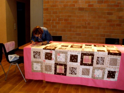 Στην παρακάτω φωτογραφία η Μαρία Καλαμαρα, κάθεται στο πάτωμα μπροστά από το τραπέζι της με τα εξάγωνα. Η Μαρία έδειχνε την τεχνική αυτή κατά τη διάρκεια της έκθεσης!