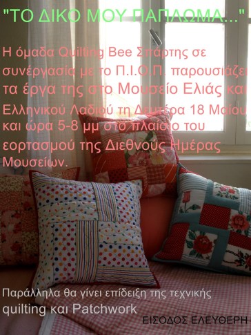 Η Μελισσοπαρέα (Quilting Bee) της Σπάρτης οργάνωσε μια έκθεση της μιας μέρας στις 18 Μαίου, που ήταν η Διεθνής Ημέρα Μουσείων. Η κεντρική ιδέα της έκθεσης ήταν η “ανακύκλωση” Και μια και τα περισσότερα έργα τους φτιάχνονται από χρησιμοποιημένα υφάσματα, τους ζητήθηκε να τα εκθέσουν και να δείξουν τις τεχνικές που χρησιμοποιούν για να τα φτιάξουν.