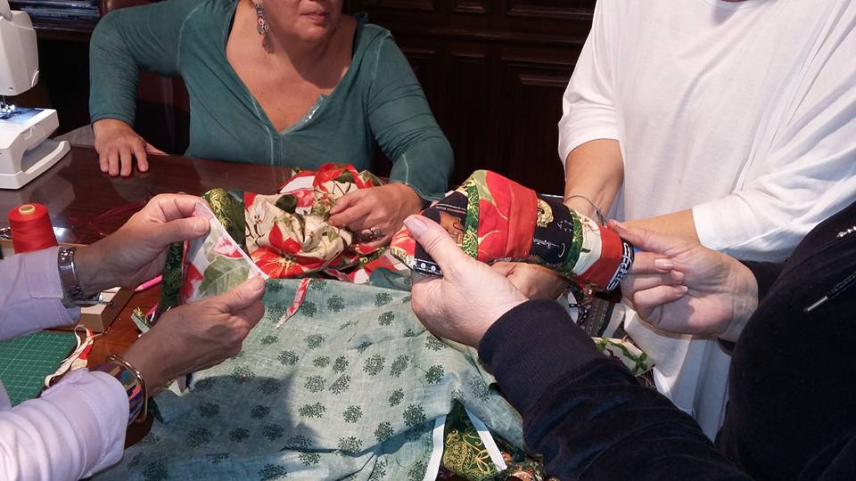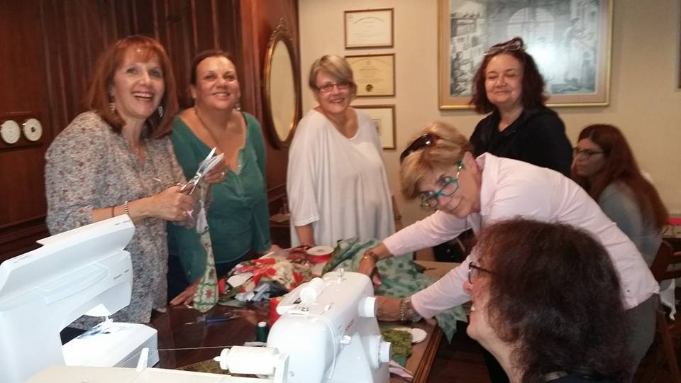 Τα μέλη του ΔΣ αλλά και η πάντα δίπλα μας Χρύσα κουβαλήσαμε τις μηχανές μας, σίδερα, σιδερώστρες, επιφάνειες κοπής, εργαλεία και υφάσματα, ενώ τα βοηθητικά υλικά (βάτες, φερμουάρ και αράχνη) ήταν προσφορά της Χριστίνας Δεληγιάννη και του καταστήματος Charm Pack και αρχίσαμε, αφού πρώτα κρεμάσαμε το Ελληνικό μας πάπλωμα και σήμα κατατεθέν του Συλλόγου μας.
