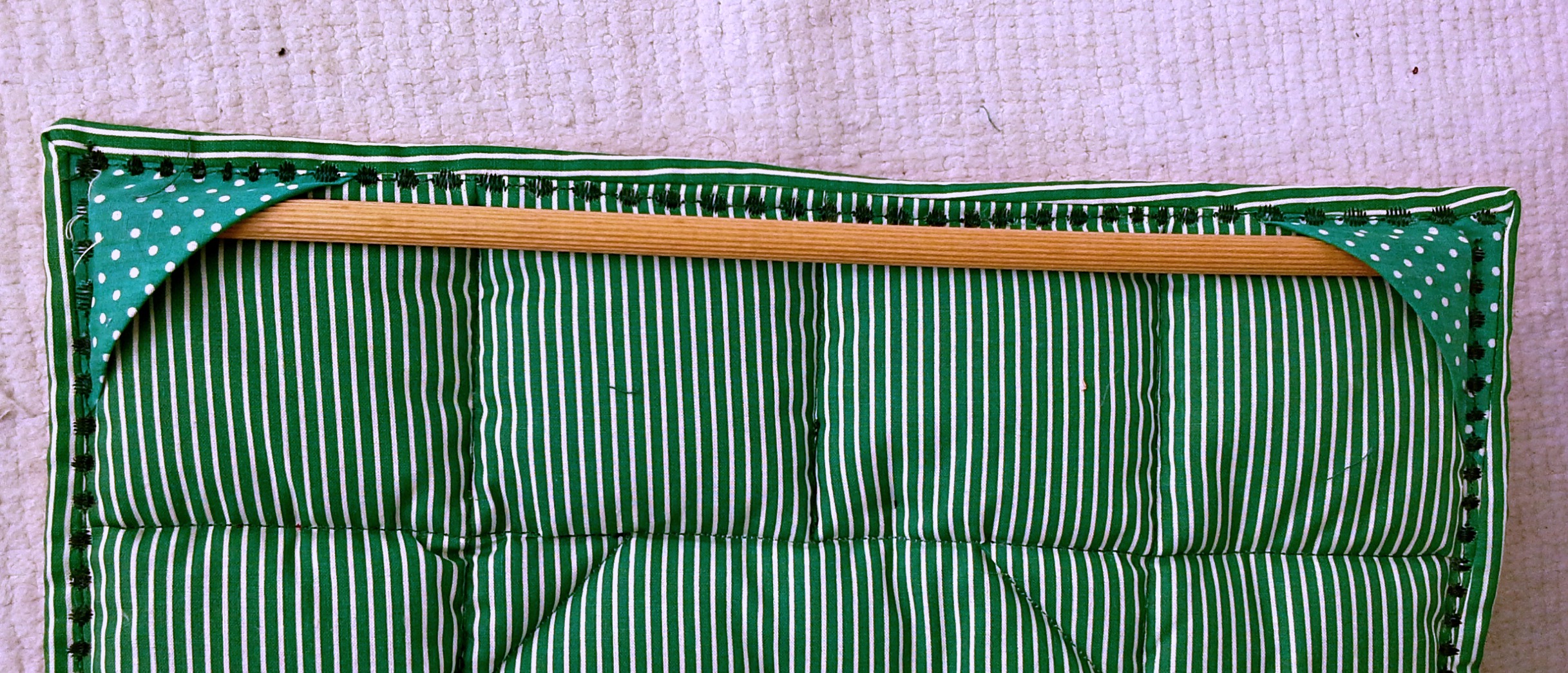 Και σας δείχνω και την πίσω πλευρά με έναν εύκολο τρόπο να στερεώσετε το πηχάκι που θα τον κρεμάσετε. Ο τρόπος αυτός ενδείκνυται όταν το έργο μας δεν έχει μεγάλο φάρδος. Χρειαζόμαστε δύο τετράγωνα κομμάτια ύφασμα. Τα δικά μου είχαν μέγεθος περίπου 8 εκ. Στο αριστερό μέρος της αριστερής φωτογραφίας βλέπετε πώς τα τοποθετούμε. Στη συνέχεια τα διπλώνουμε πάνω στη διαγώνιο, όπως βλέπετε στο δεξιό σημείο και καρφιτσώνετε. Όταν γαζώσετε το ρέλι, θα γαζωθούν κι αυτά στη θέση τους. Τελειωμένα τα βλέπετε στη δεξιά φωτογραφία.