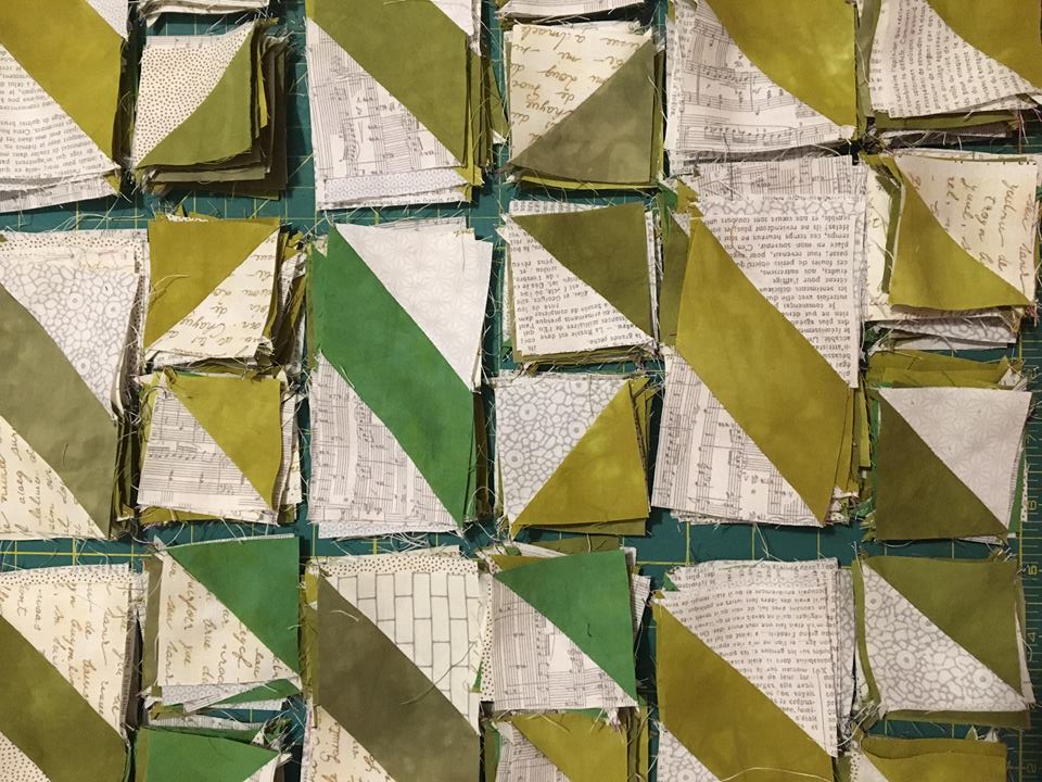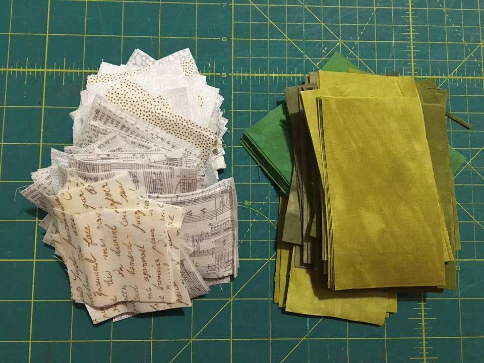 Easy cutting but so many seams and ironing this week! I cut my pieces. Greens are from our hand dyed fabrics. You may find instructions here.