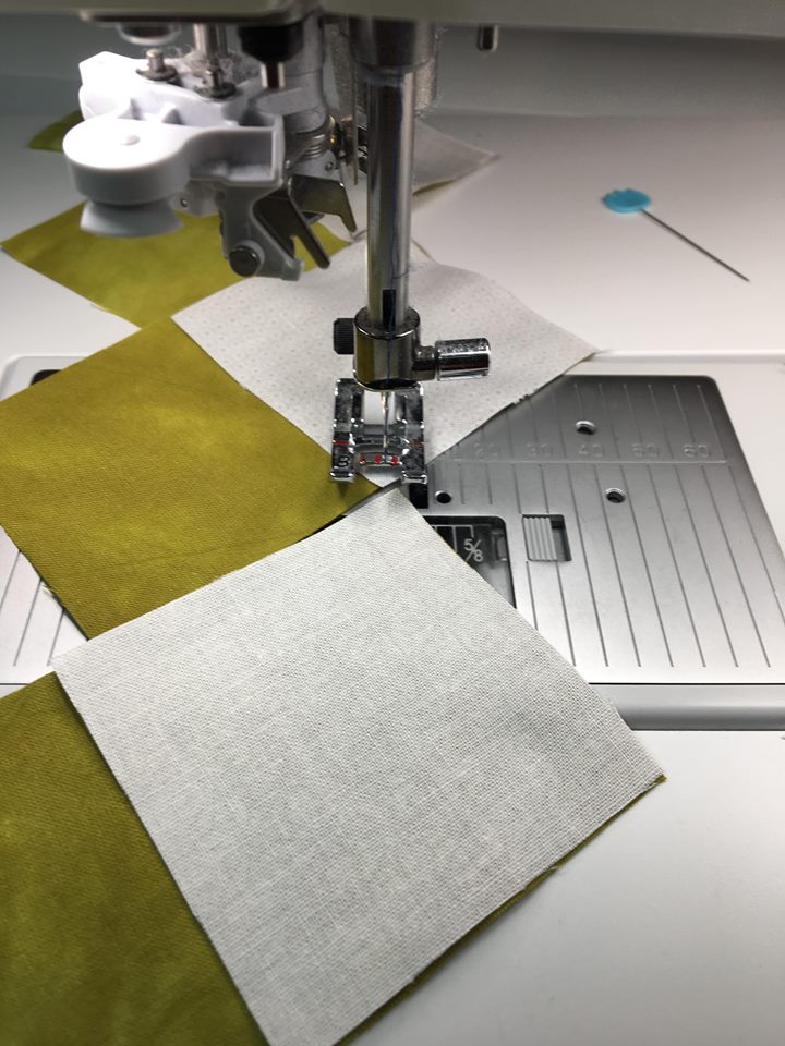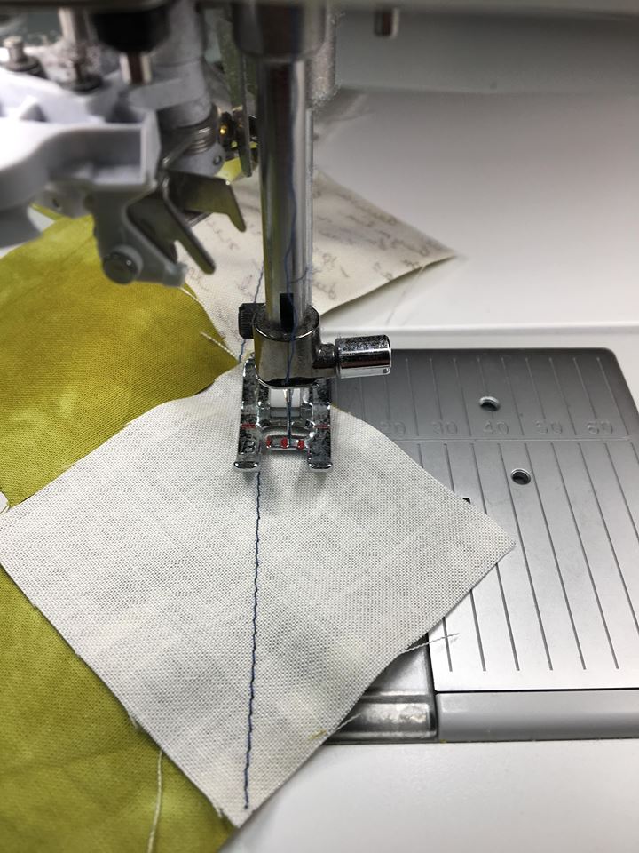και μετά τη δεύτερη. Πολύ κοντά στην πρώτη. Ελπίζω η Μπόνι να ξέρει τι κάνουμε. Πρώτη φορά αφήνω τόσο μικρό περιθώριο ραφής. Για να το κάνω και να μου βγει σωστό το μέγεθος του μικρού τετραγώνου μετακίνησα τη βελόνα μου προς τα δεξιά (το ξέρω ότι δεν μπορούν όλες οι μηχανές να το κάνουν) κι έβαλα σημάδι στο εσωτερικό της αριστερής μεριάς στο ποδαράκι για την πρώτη ραφή.
