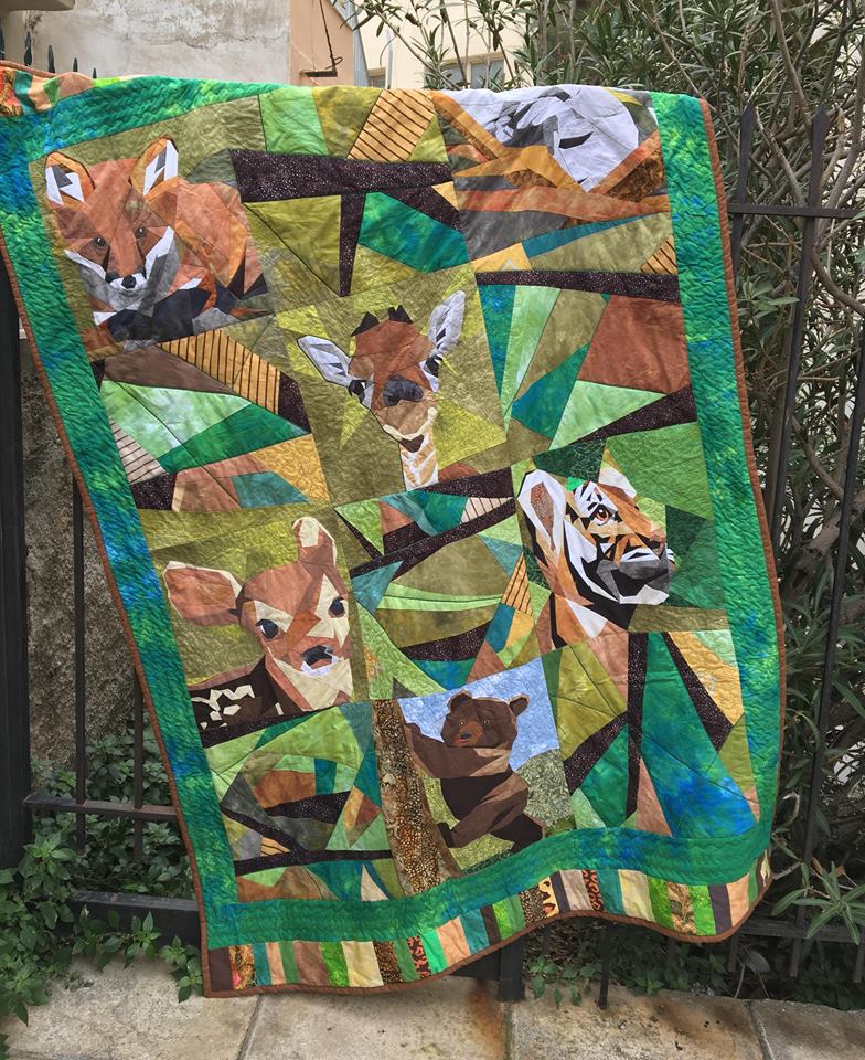 Αφού λοιπόν έφτιαξα το λιοντάρι για τον Γιώργη, ανέσυρα και τα ζωάκια για τον Προκόπη. Σχεδίασα 6 τετράγωνα crazy και ιδού το πάπλωμα. Κεφαλάκια ζώων που ξεπροβάλλουν μέσα από άγρια βλάστηση. To 95% των υφασμάτων είναι από τα χειροβαμμένα μας.