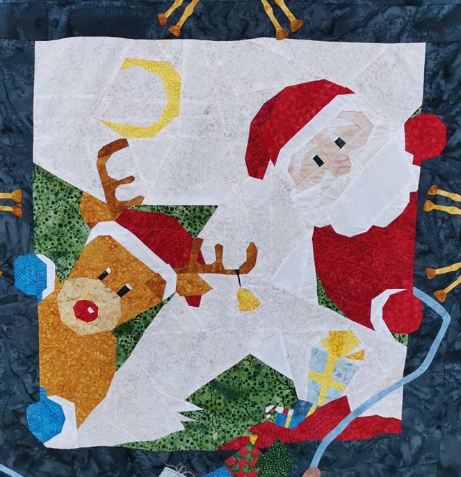And with this and that, my quilt ended to be supersized. Almost 95″ * 95″. For the central piece, I used Santa and Rudolph pattern by Janeen van Niekerk. Foundation Paper Pieceing is the technique.
