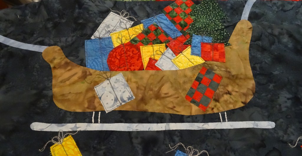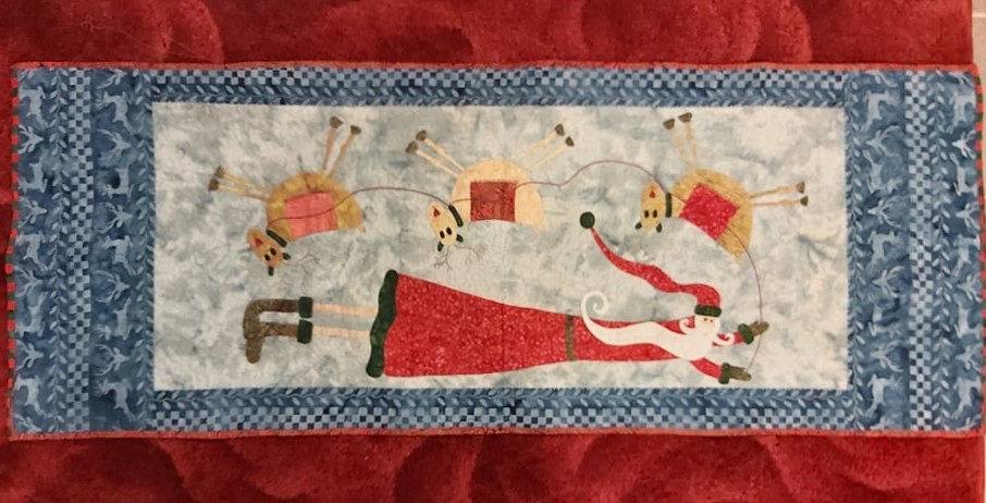 Reinders on the first border were made based on the Flying Santa pattern by Lynette Anderson in needleturn applique and hand embroidery. I had made this runner for a previous challenge. You may see more details here.