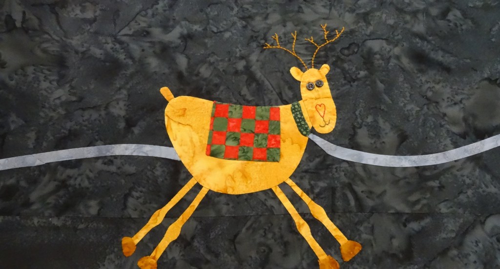 Στο πρώτο πλαίσιο οι τάρανδοι έγιναν με βάση τα πατρόν από το σχέδιο “Ιπτάμενος Αη Βασίλης” (Flying Santa) της Lynette Anderson και την τεχνική του γυριστού απλικέ και λεπτομέρειες με κέντημα στο χέρι. Είχα κάνει για κάποια άλλη πρόκληση ένα ράνερ. Μπορείτε να δείτε περισσότερες λεπτομέρειες εδώ.