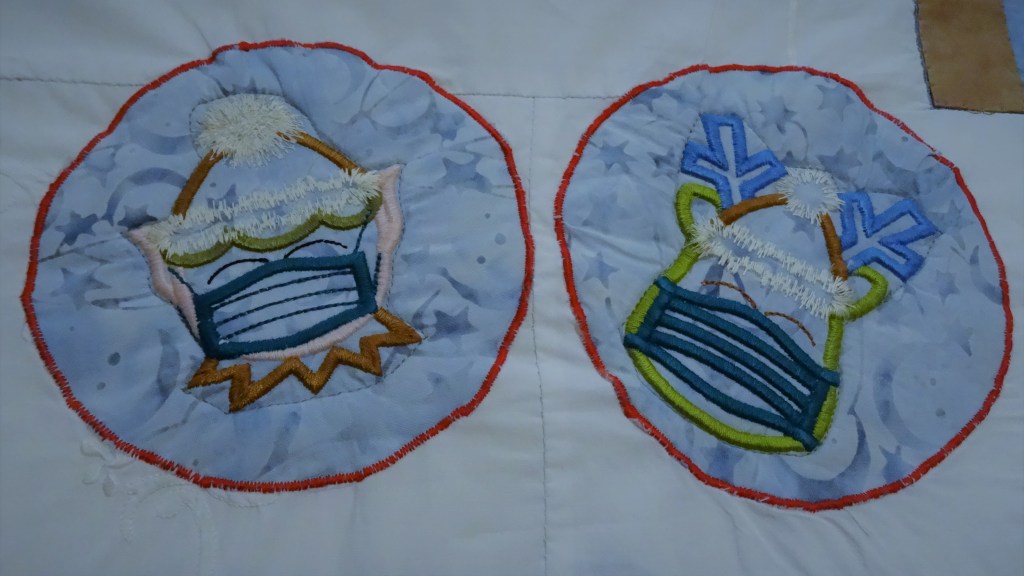 και τα προειδοποιητικά στρογγυλά σήματα για τις μάσκες, που κεντήθηκαν ξεχωριστά και απλικαρίστηκαν πάνω στο πάπλωμα. Όλα ήταν σχέδια από τη σελίδα Alphalicious designs.