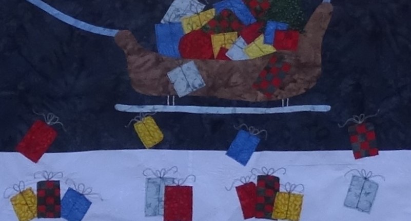 Με αυτά και μ’ εκείνα, το πάπλωμα κατέληξε να γίνει υπέρδιπλο, σε διαστάσεις 2,40 επί 2,40 μ. Στο κεντρικό κομμάτι, χρησιμοποιήθηκε ένα σχέδιο της Janeen van Niekerk με τίτλο “Ο Αη Βασίλης και ο Ρούντολφ” (Santa and Rudolph). Η τεχνική του είναι Πάτσουγορκ πάνω σε χαρτί βάσης.