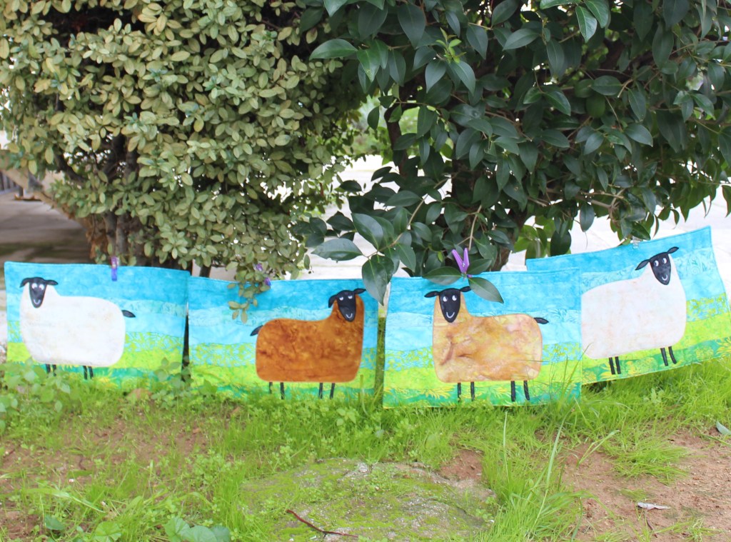 Έφτιαξα το background με την τεχνική των τυχαίων καμπυλών και μετά απλικάρισα και καπιτονάρισα ταυτόχρονα τα προβατάκια που μου σχεδίασε η Αφροδίτη μας.