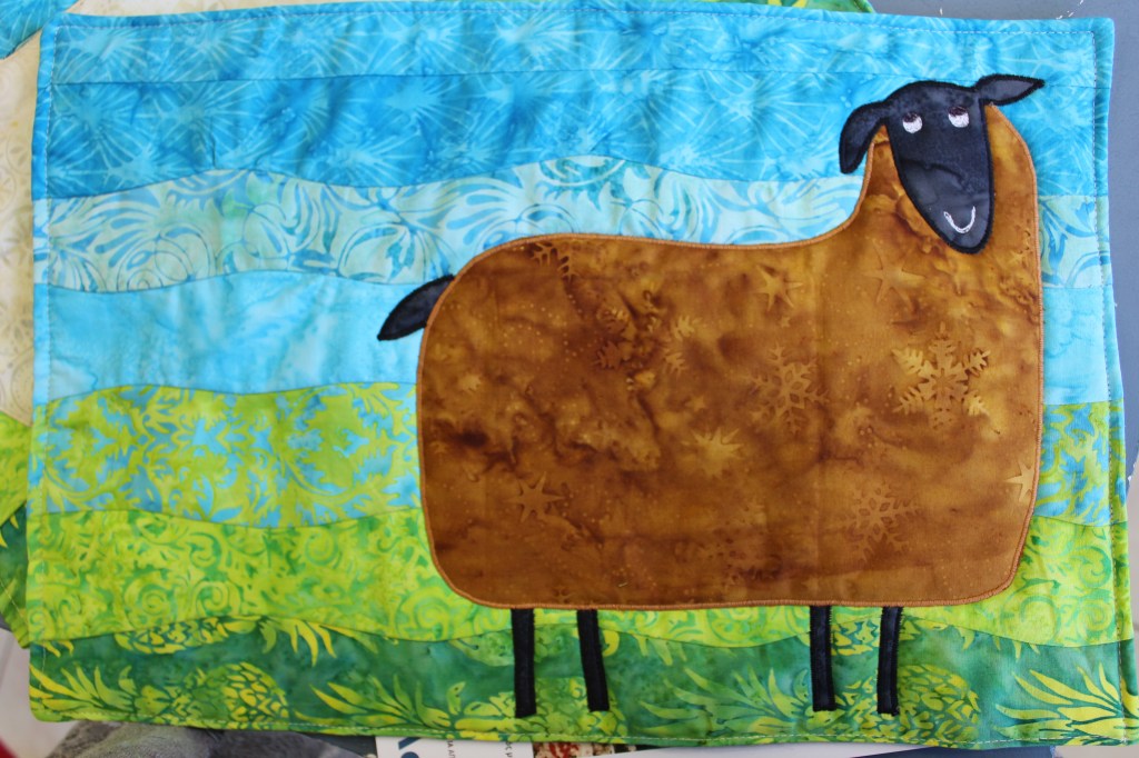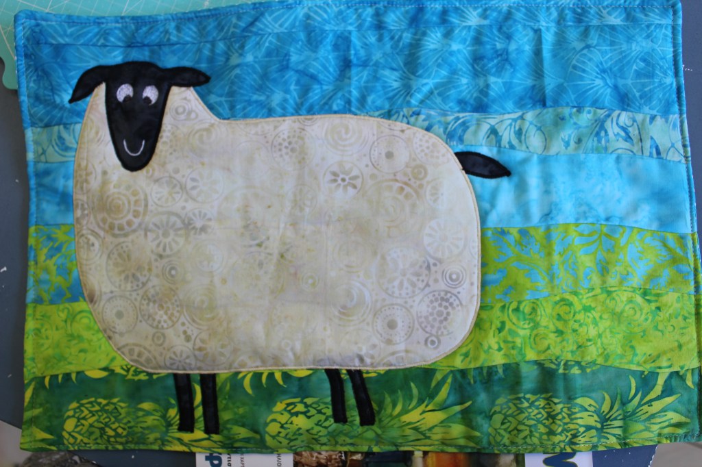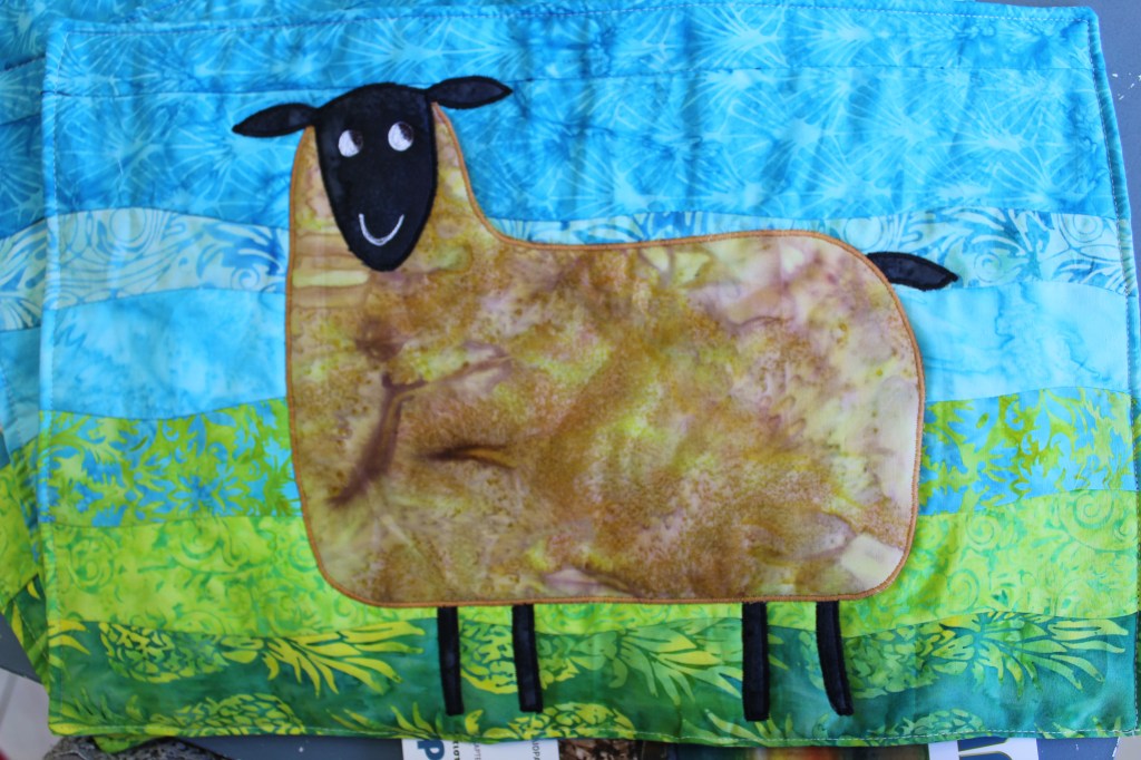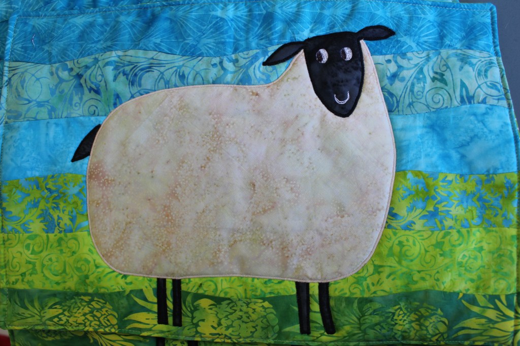 I made the background in random curves technique and then I appliqued and quilted at the same time the sheep designed by my DIL.
