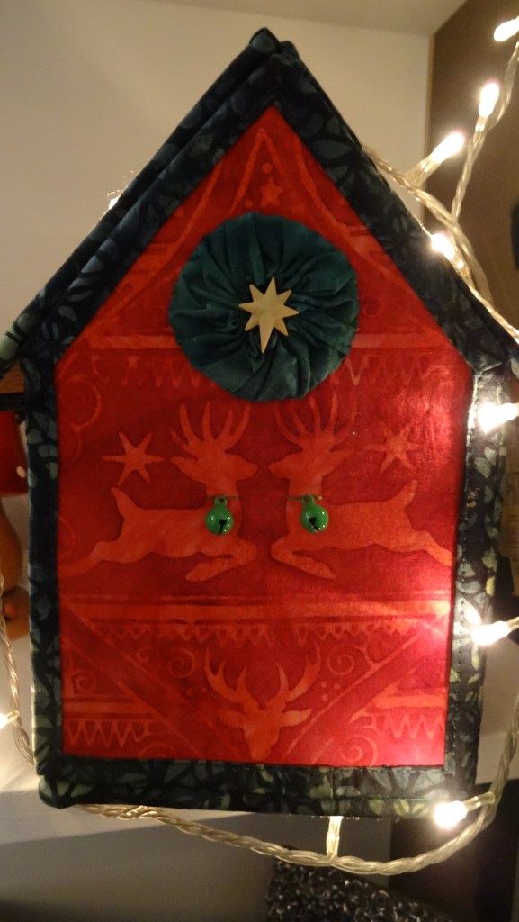 Είχα λοιπόν κάποια υπολείμματα από προηγούμενη συλλογή που μου είχαν στείλει τα Island Batik. Είχα φτιάξει τότε ένα πάπλωμα για τον μεσαίο μας, τον Προκόπη. Όταν λοιπόν έψαχνα στα υφάσματά μου για να κάνω κάτι γι αυτό τον μήνα, βρήκα τα υπολείμματά αυτά και αμέσως σκέφτηκα γιατί να μην κάνω ένα σπιτάκι Χριστουγεννιάτικο για να το βάλω δίπλα στο χωριό του Αη Βασίλη που έχει κι αυτό μια γεύση πάτσγουορκ μια και είναι του γνωστού στην Αμερική Jim Shore που φτιάχνει πράγματα με βάση το πάτσγουορκ. Εγώ τον έμαθα όταν πουλούσαμε τέτοια αντικείμενα στο μαγαζί με είδη δώρων που είχε o σύζυγός μου πριν το 2011.
