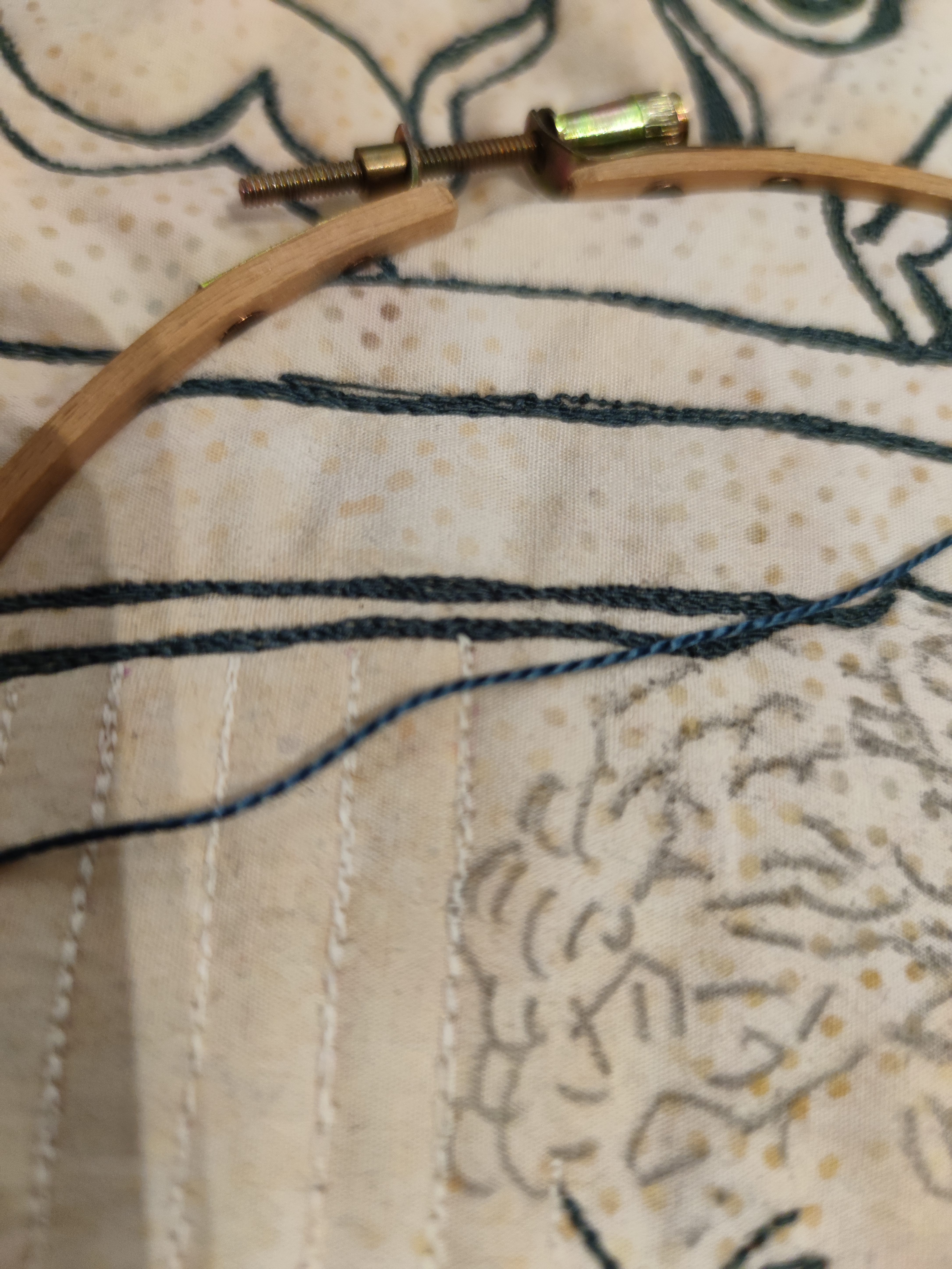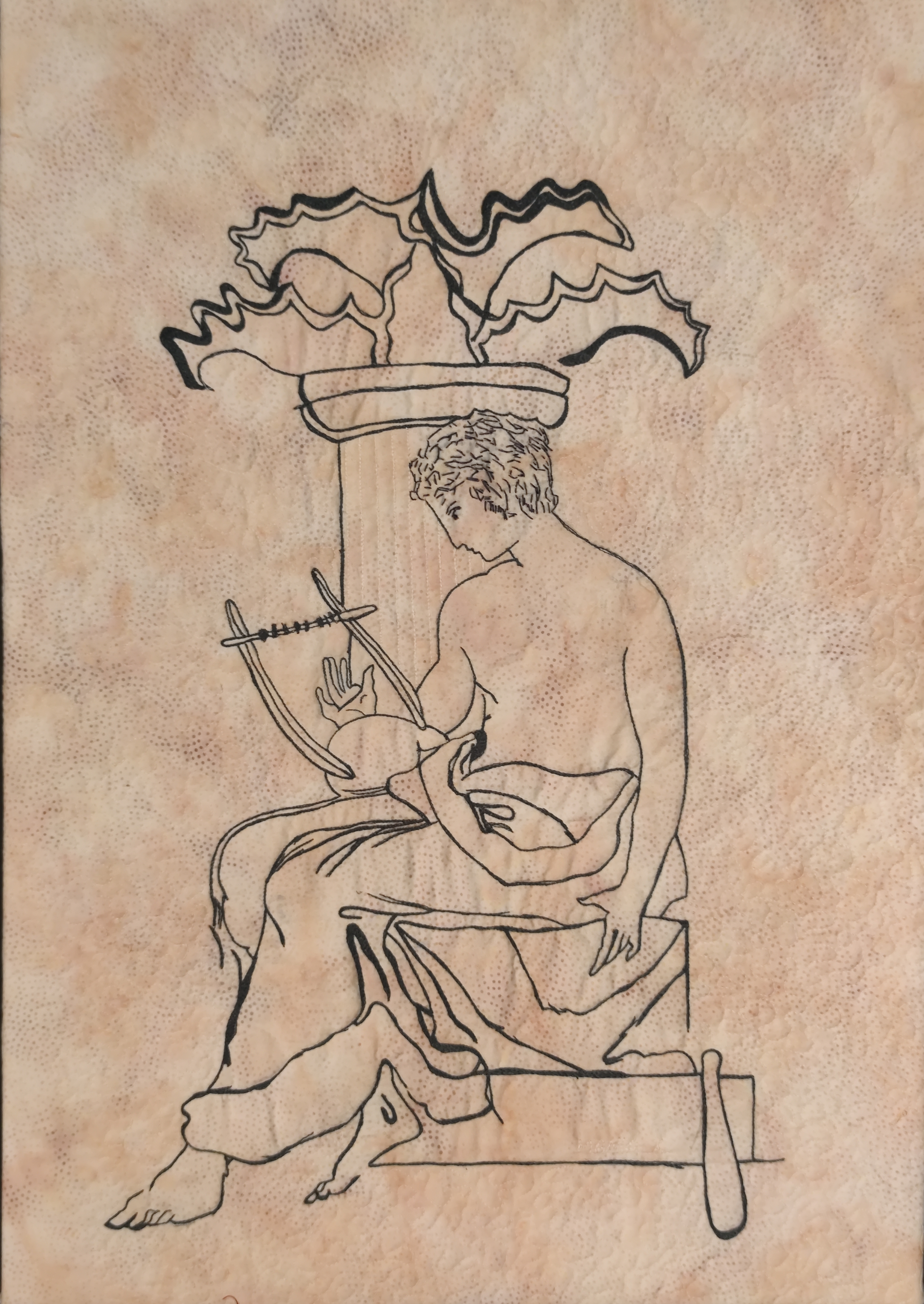 It is based on the original work made by Tassos Lambropoulos. You may see the original on the left below, used for the poster of the 17th Fairytales Festival at the island of Kea/Greece. The size of my work is 20″ x 27.50″. I thread painted it on a neutral IB fabric and then densely quilted in free motion stippling using the same thread color by Aurfil in order to have just the relief. I also used some remnants from Hobbs batting sent to me in previous boxes.