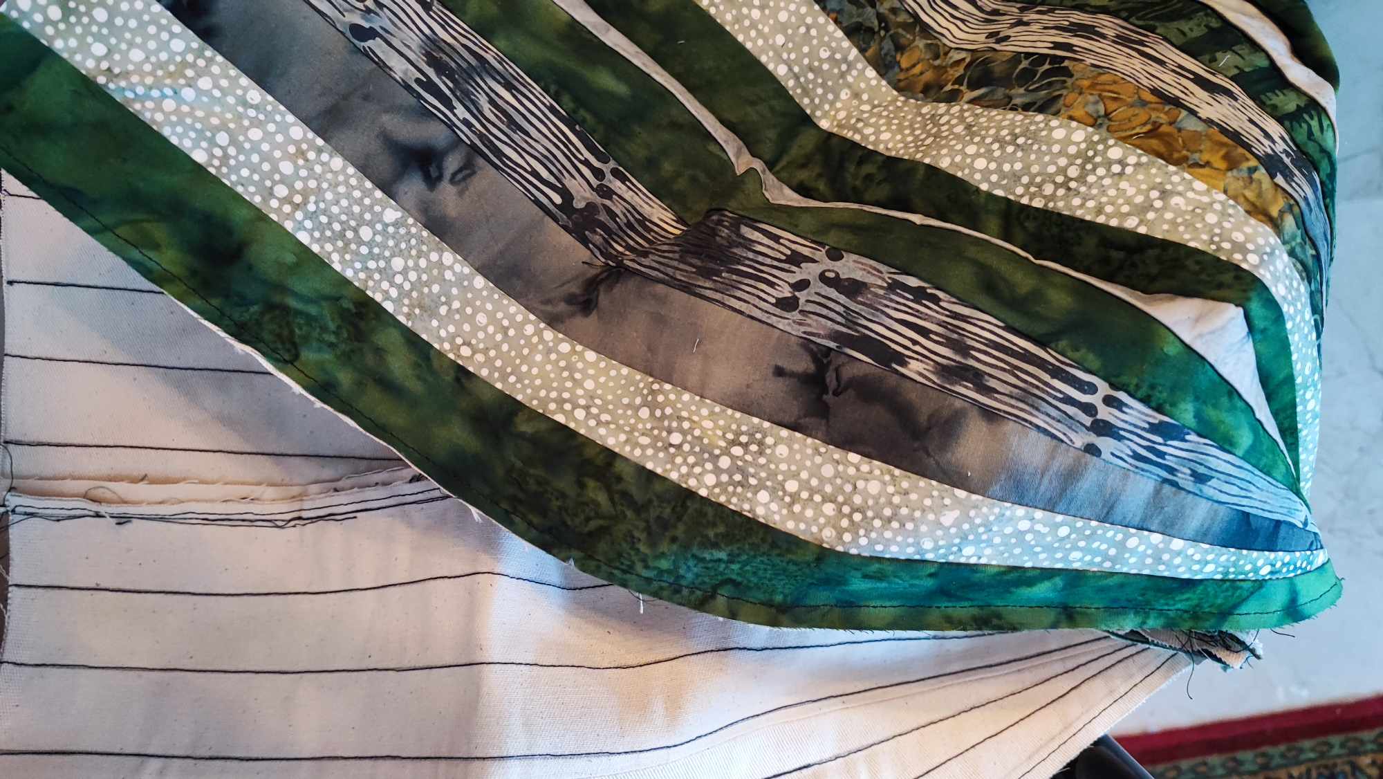 March brought a free month by the Island Batik for us determine our own project of any size, using any theme and any technique!! This was an opportunity for us to express our creativity without guidelines. And that was an opportunity for me to make another tuffet for my son this time, since I hade made another one for our Program 6 years ago (you may see it here). They love green and I had many stripes of assorted green and grey colors. I started working on it but I lost all of my photos except from the following:
