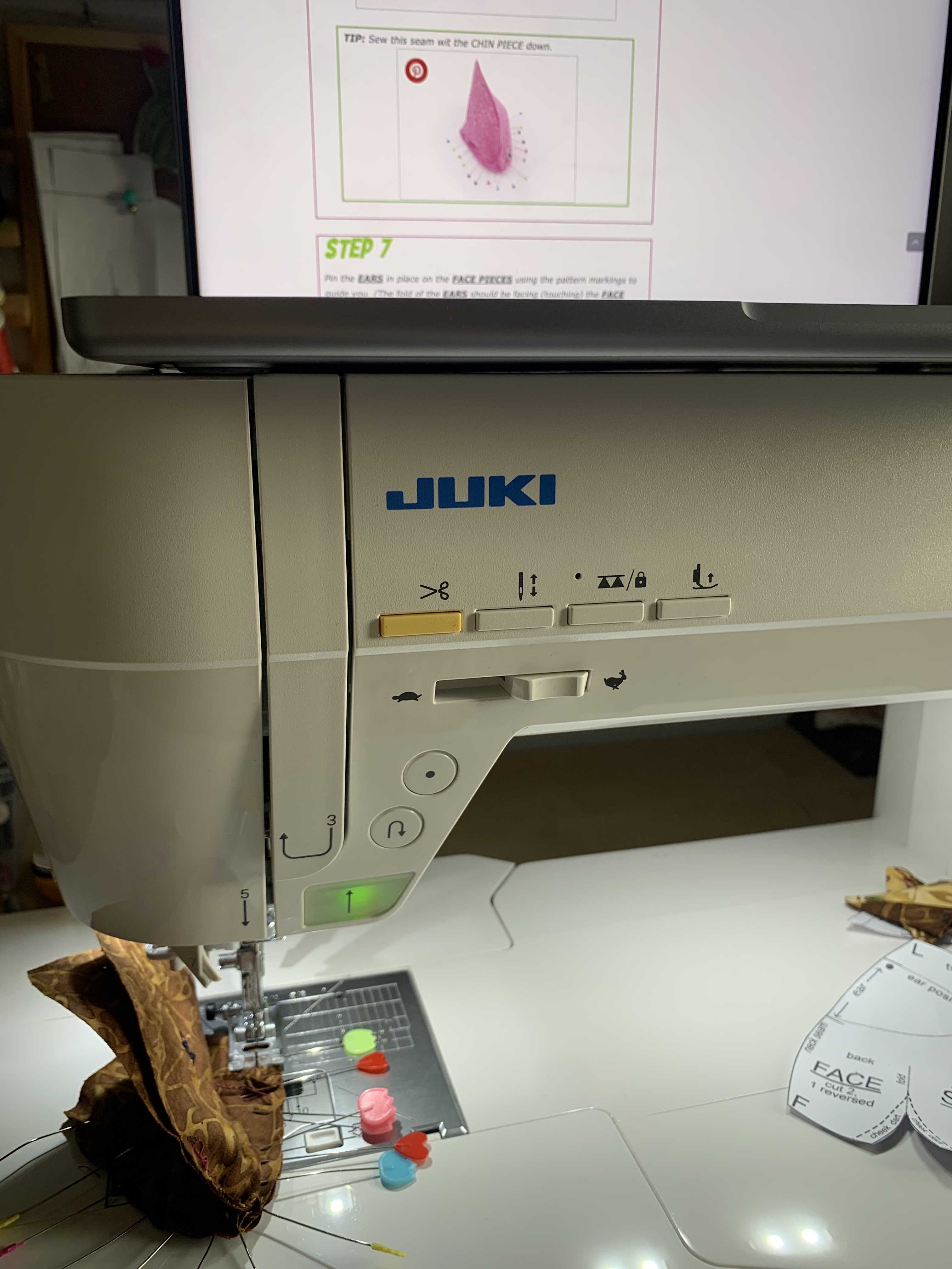 I chose two fabrics from previous shipments from Island Batik for their Ambassadors Program and started working. I also chose a fur piece for the tail. I cut every piece of pattern and pinned them on the fabrics.