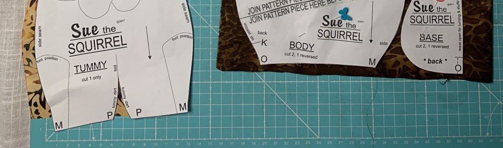 Διάλεξα δυο υφάσματα από προηγούμενες αποστολές των Island Batik για το πρόγραμμά τους των Πρεσβευτών και άρχισα να δουλεύω. Διάλεξα επίσης ένα κομμάτι γουνάκι για την ουρά. έκοψα όλα τα κομμάτια του σχεδίου και τα καρφίτσωσα πάνω στα αντίστοιχα υφάσματα.