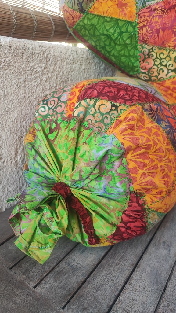 When I prepared the 4 pairs, then I joined twice two pairs and I finally had 2 square bigger quilts. I then cut two more pieces of fabric (without any batting and quilting) and sewed them on two sides of the quilt. Then I joined the other sides. I put the pillow in and tied them with a ribbon. Therefore I made the quilts into two pillows!