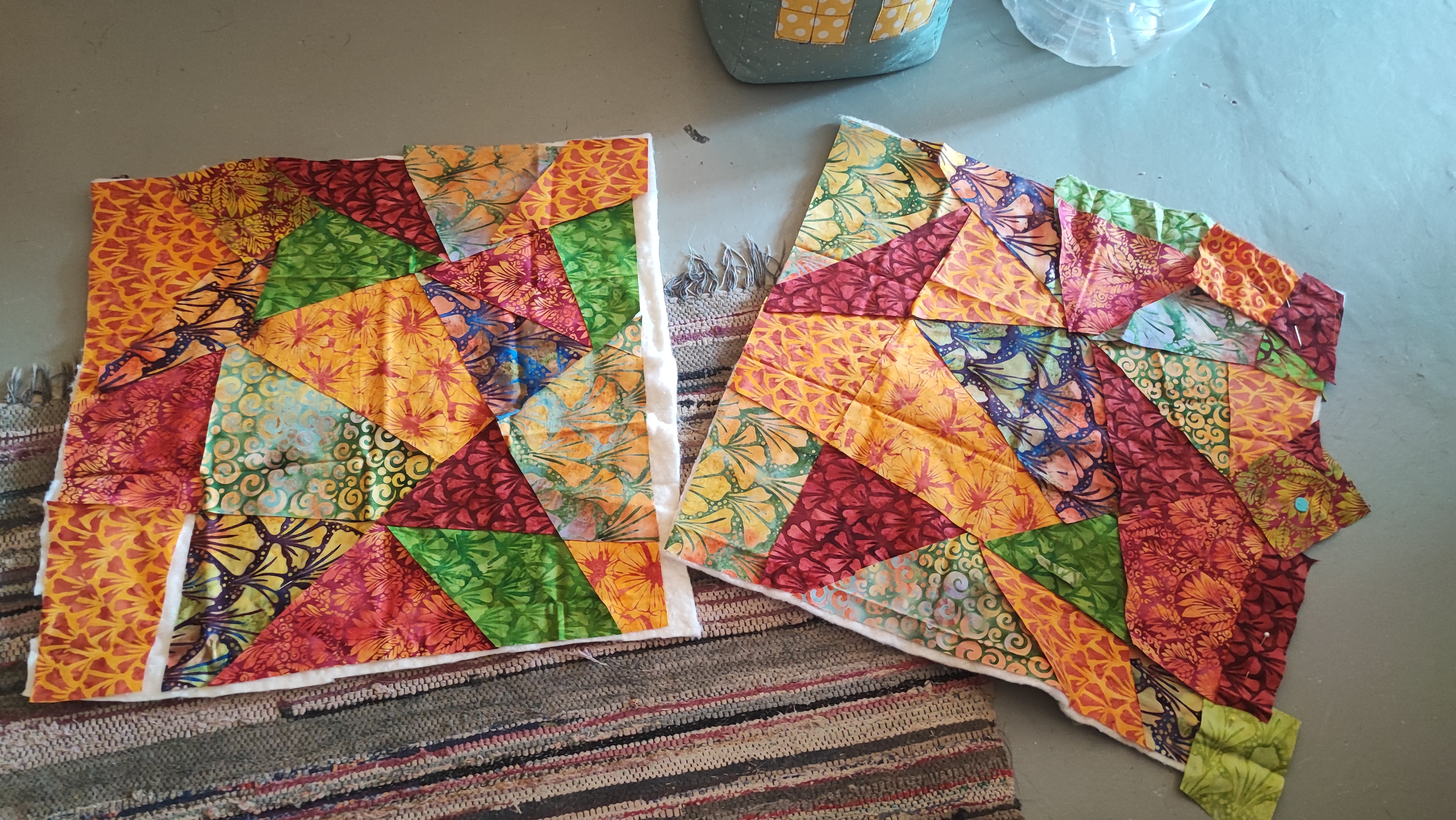 Εκοψα μετά 8 τετράγωνα κομμάτια από τα υφάσματα της συλλογής μου πλευράς 46 εκ. και τα έβαλα σε στοίβα κάτω από το χαρτί μου. Τα καρφίτσωσα και μετά τα έκοψα πάνω στις γραμμές και τα τοποθέτησα με βάση την εικόνα, για την οποία επίσης συγγνώμη δεν έχω φωτογραφία.