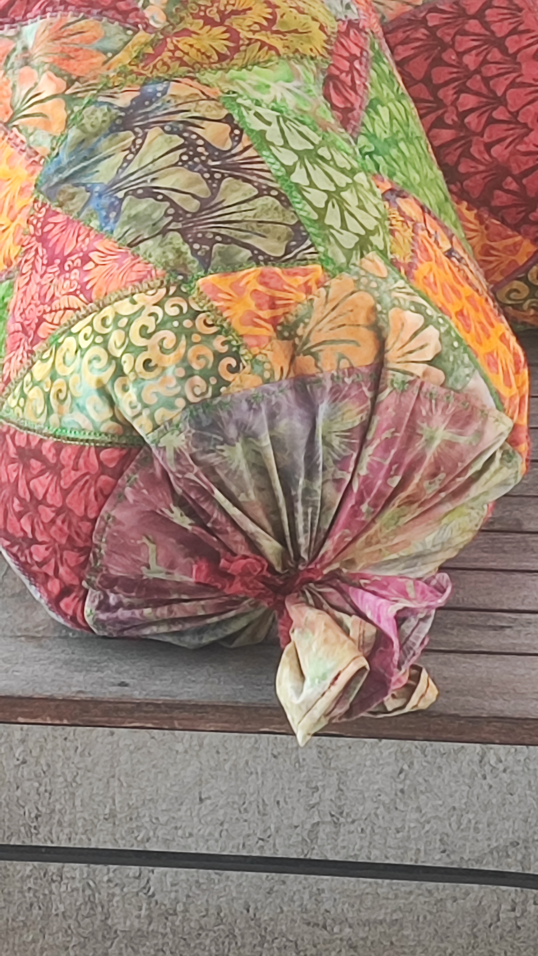When I prepared the 4 pairs, then I joined twice two pairs and I finally had 2 square bigger quilts. I then cut two more pieces of fabric (without any batting and quilting) and sewed them on two sides of the quilt. Then I joined the other sides. I put the pillow in and tied them with a ribbon. Therefore I made the quilts into two pillows!