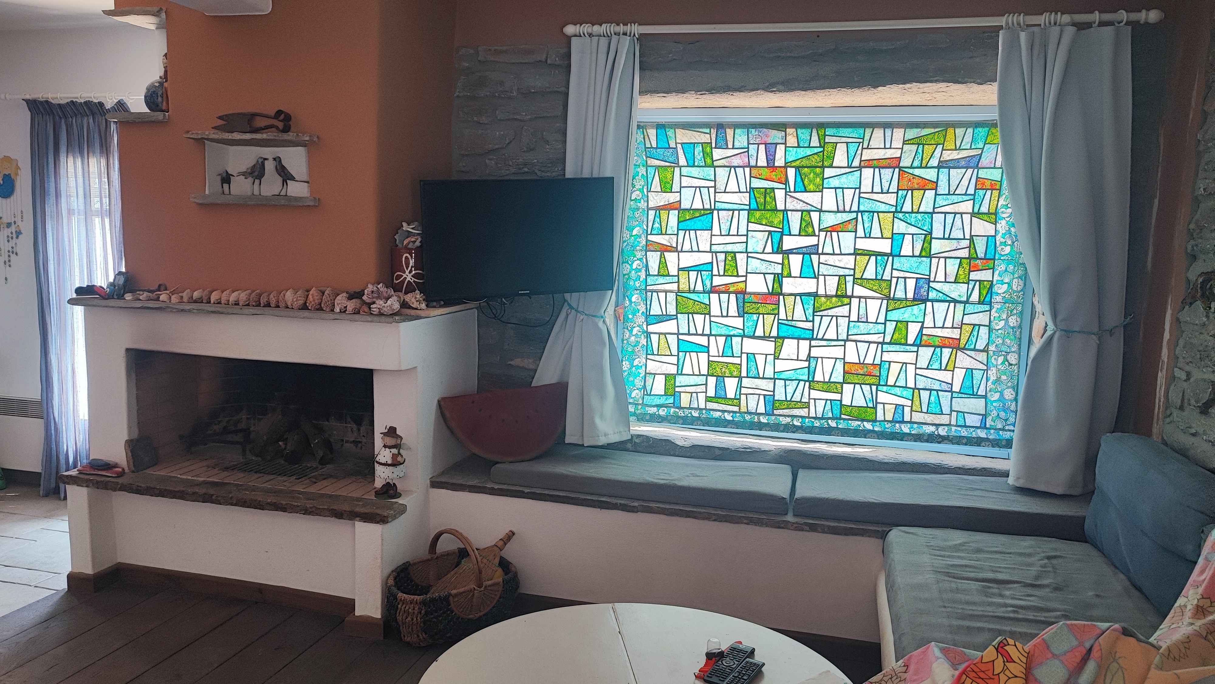 Αμέσως σκέφτηκα να φτιάξω μια κουρτίνα για το μεγάλο παράθιυρο που έχουμε στο εξοχικό μας, που βλέπει στην Ανατολή. Το μέγεθος είναι 1,60 * 1,20 μ.. περίπου. Τεράστια δουλειά, όπως αποδείχτηκε και αυτός ήταν και ο λόγος που μου πήρε τόσο πολύ να το τελειώσω, μια και δούλευα μόνο στις καλοκαιρινές διακοπές.