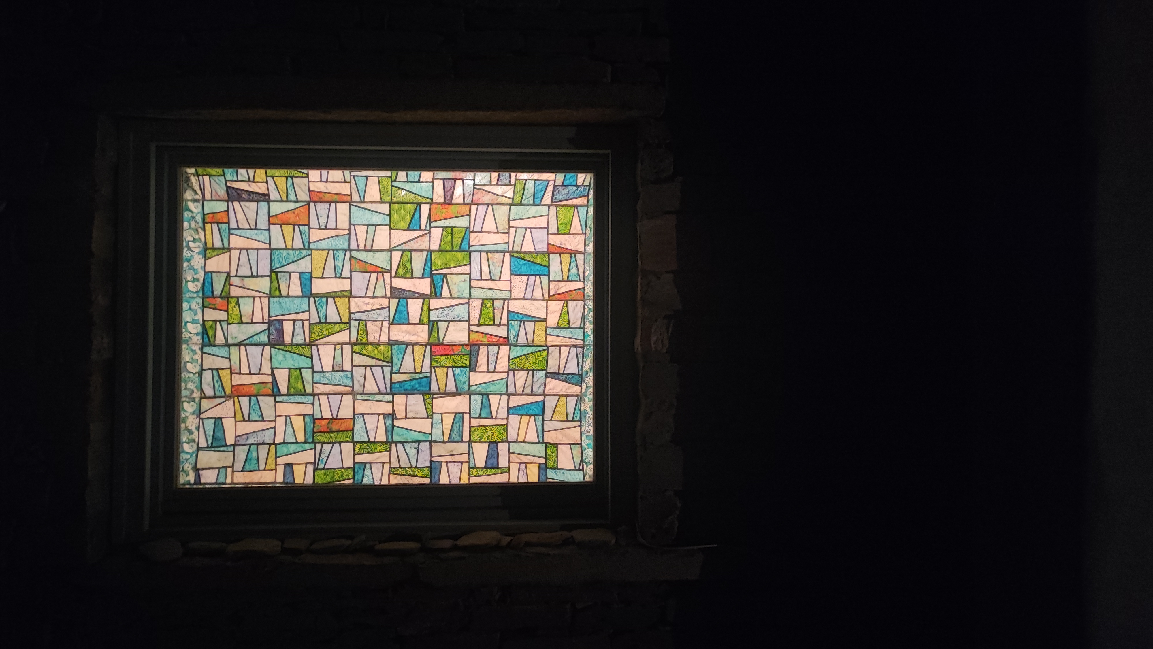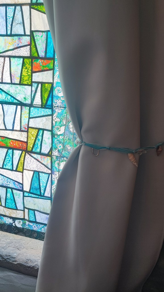 I immediately thought of sewing a curtain for a big window we have in our summer house, where the sun rises in front of this window. The size is 1,60 * 1,20 m. appx. Huge work as proved and this is the reason it took me so long. I only was working on it while at the summer house.