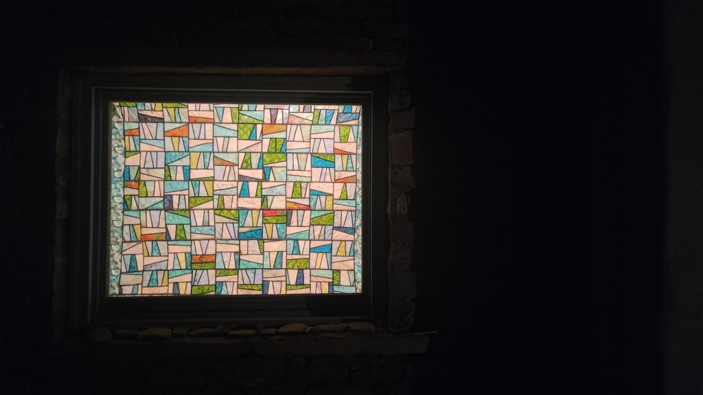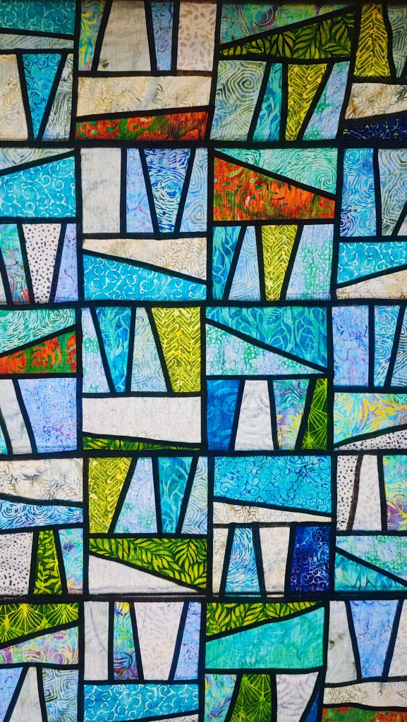 Γι’ αυτό το έργο χρησιμοποίησα πολλές λωρίδες από τα ρολλάκια που μας στέλνουν στα χρώματα που ήθελα να χρησιμοποιήσω. Εκοψα άπειρα κομμάτια, τα ένωσα πρώτα σε ορθογώνια στοιχεία και μετά σε λωρίδες, Χρησιμοποίησα την Juki μου γιατί υπήρχαν σημεία στις ραφές που ήταν πολύ δύσκολα.